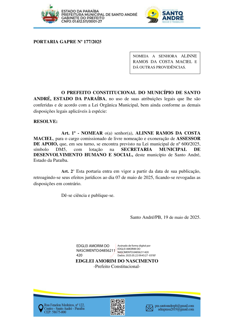 PORTARIA GAPRE Nº 177/2025 - NOMEIA A SENHORA ALINNE RAMOS DA COSTA MACIEL E DÁ OUTRAS PROVIDÊNCIAS.