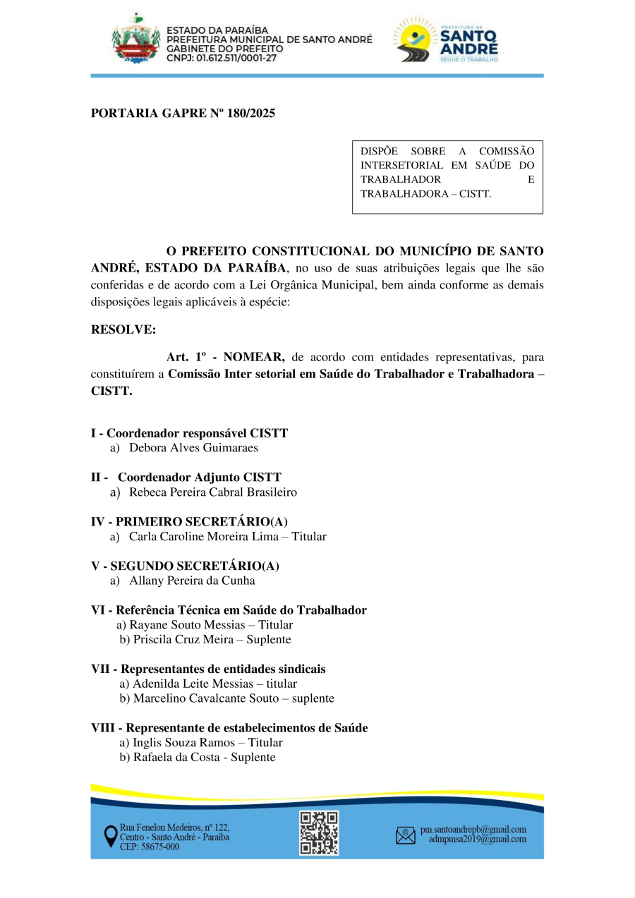 PORTARIA GAPRE Nº 180/2025 - DISPÕE SOBRE A NOMEAÇÃO DA COMISSÃO INTERSETORIAL EM SAÚDE DO TRABALHADOR E TRABALHADORA – CISTT.