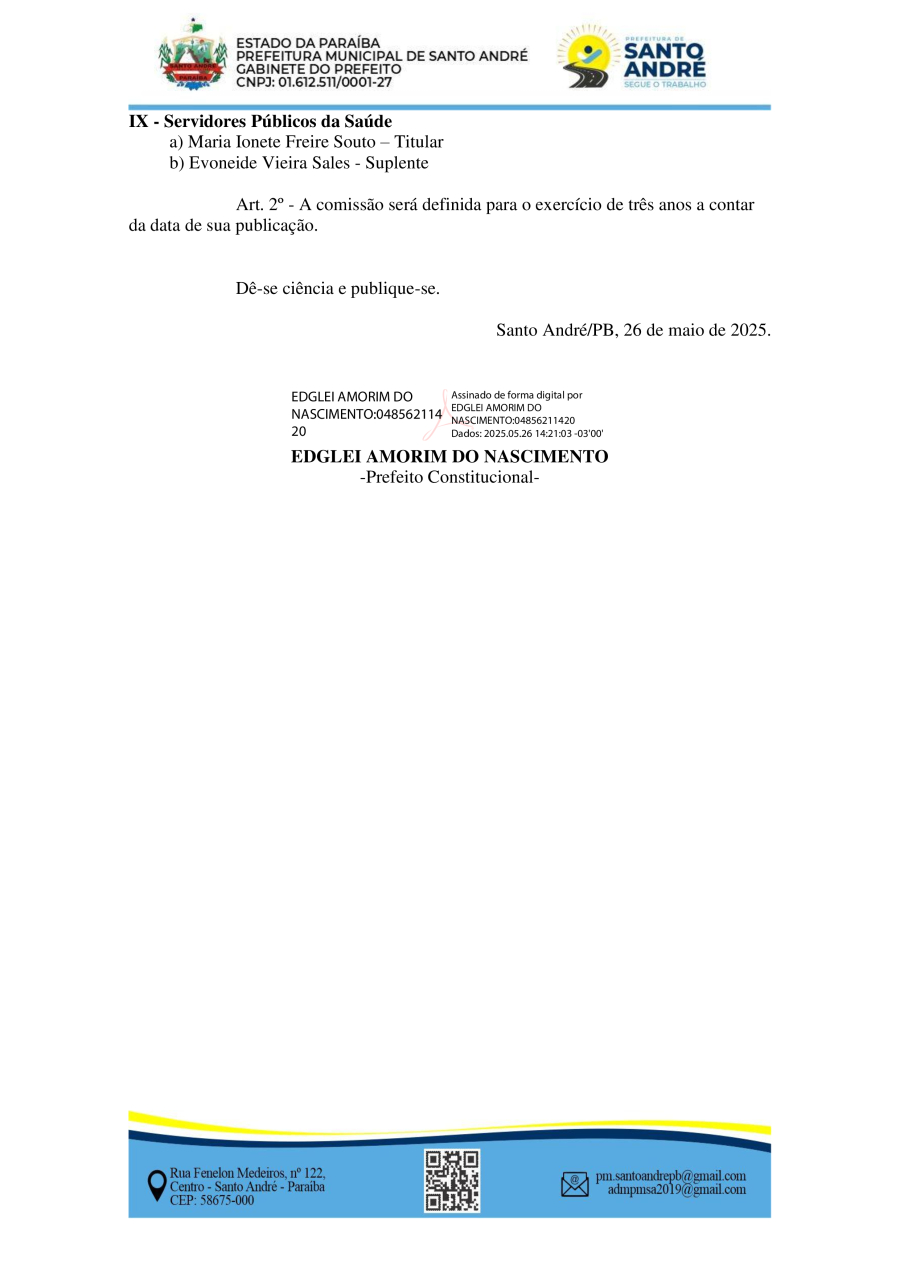 Conforme MP n° 2.200-2 de 24/08/2001, que institui a infraestrutura de chaves Públicas. Matéria Publicada no Diário Oficial do Município de Santo André/PB no dia - Edição 01221.