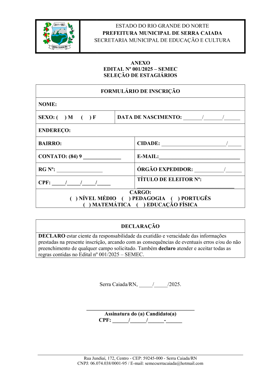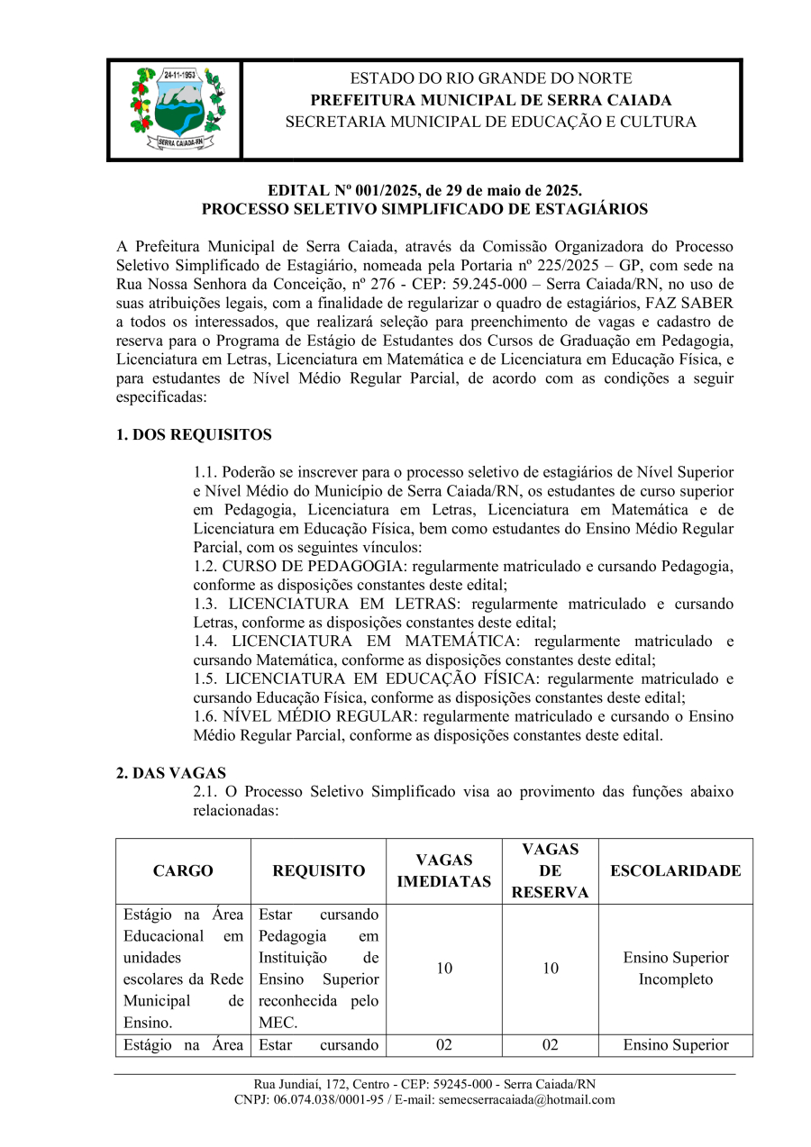 EDITAL Nº 001/2025, DE 29 DE MAIO DE 2025. PROCESSO SELETIVO SIMPLIFICADO DE ESTAGIÁRIOS