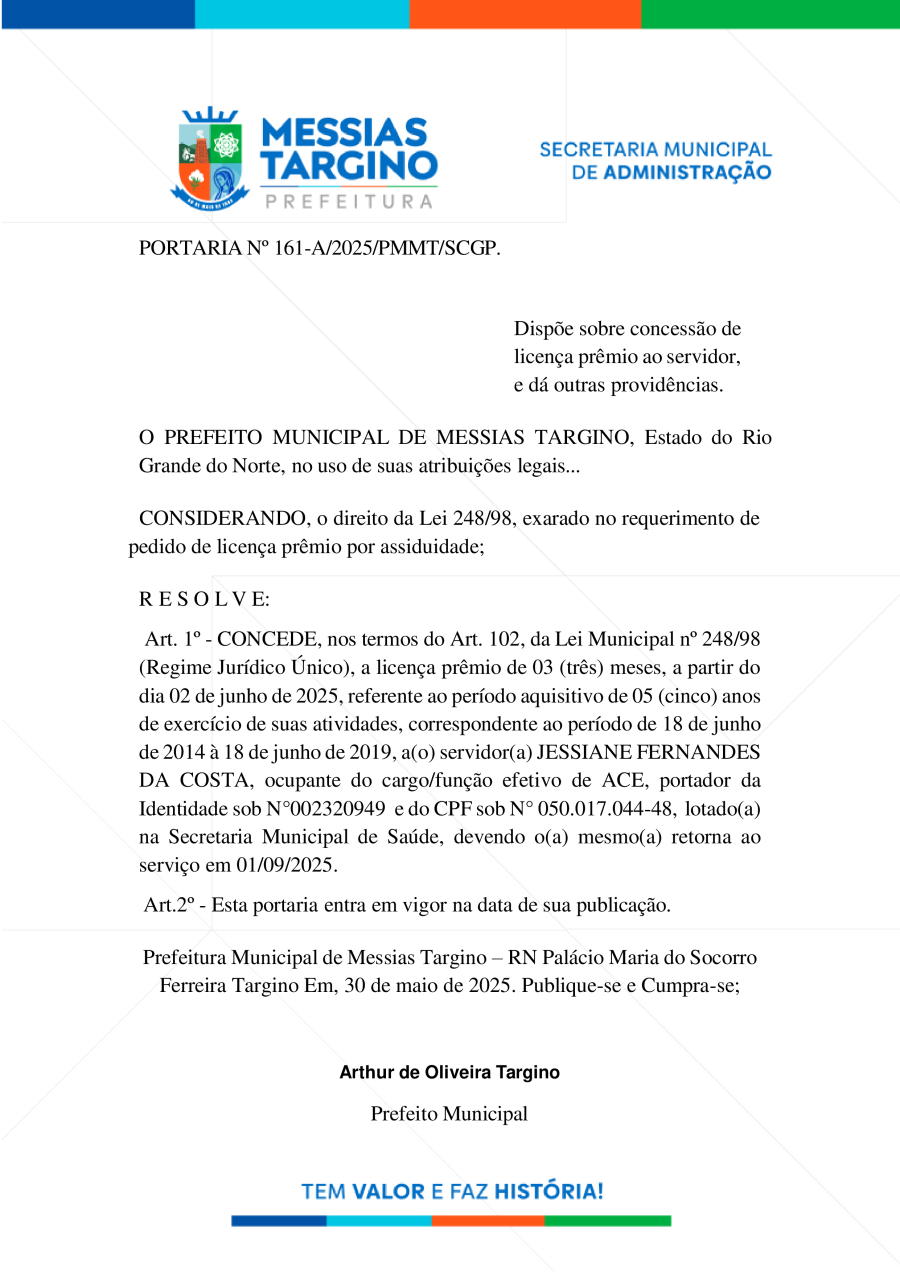 Conforme MP n° 2.200-2 de 24/08/2001, que institui a infraestrutura de chaves Públicas. Matéria Publicada no Diário Oficial do Município de Messias Targino/RN no dia - Edição 01299.