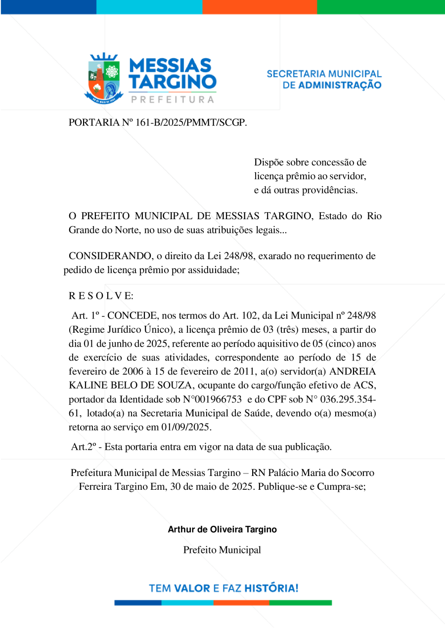 PORTARIA N°161-B - DISPÕE SOBRE CONCESSÃO DE LICENÇA PRÊMIO AO SERVIDOR.