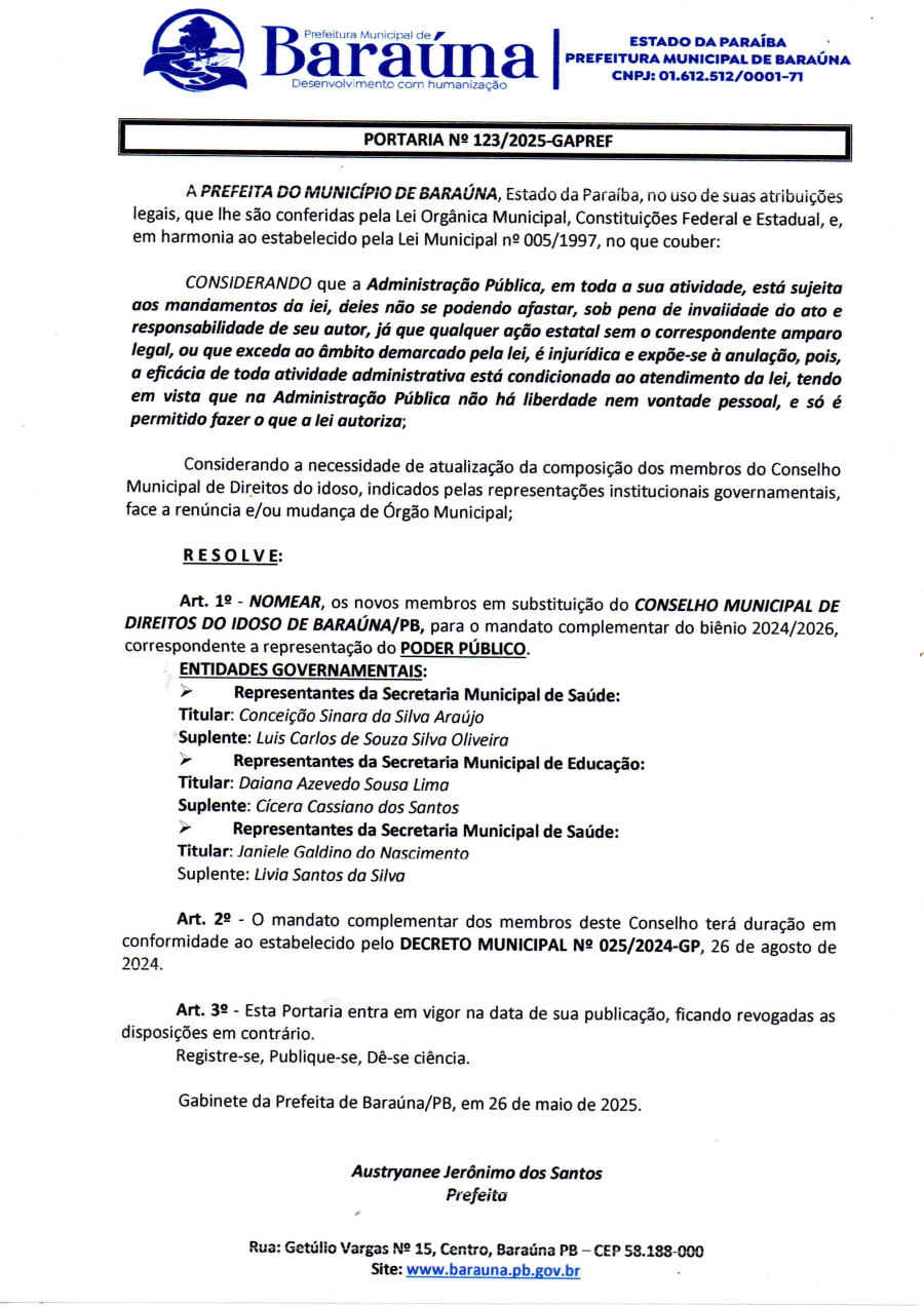 PORTARIA Nº 123/2025-GAPREF - NOMEAR NOVOS MEMBROS DO CONSELHO MUNICIPAL DE DIREITOS DO IDOSO DE BARAÚNA-PB. - 30 DE MAIO DE 2025.