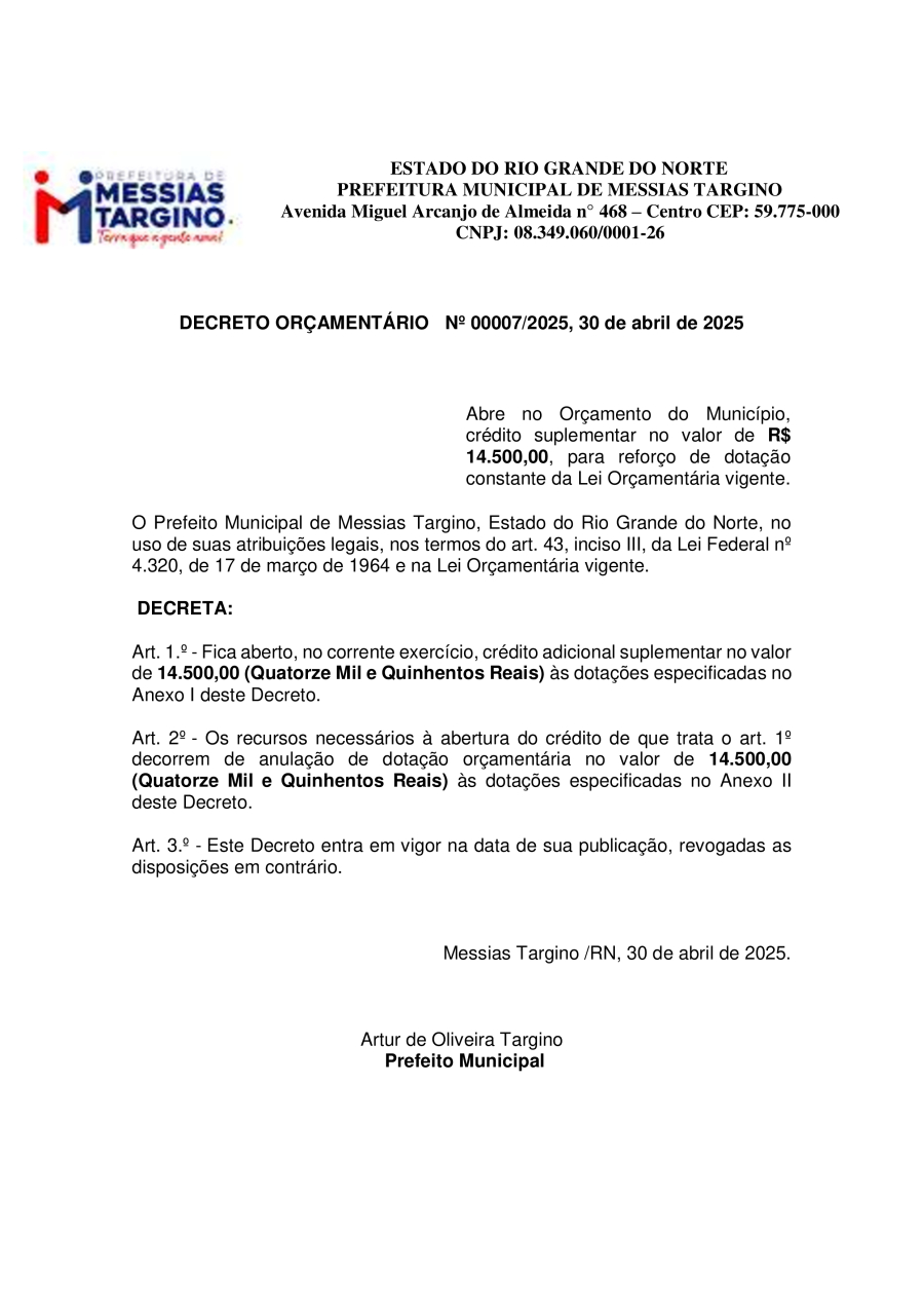 DECRETO ORÇAMENTÁRIO Nº 00007/2025, 30 de abril de 2025