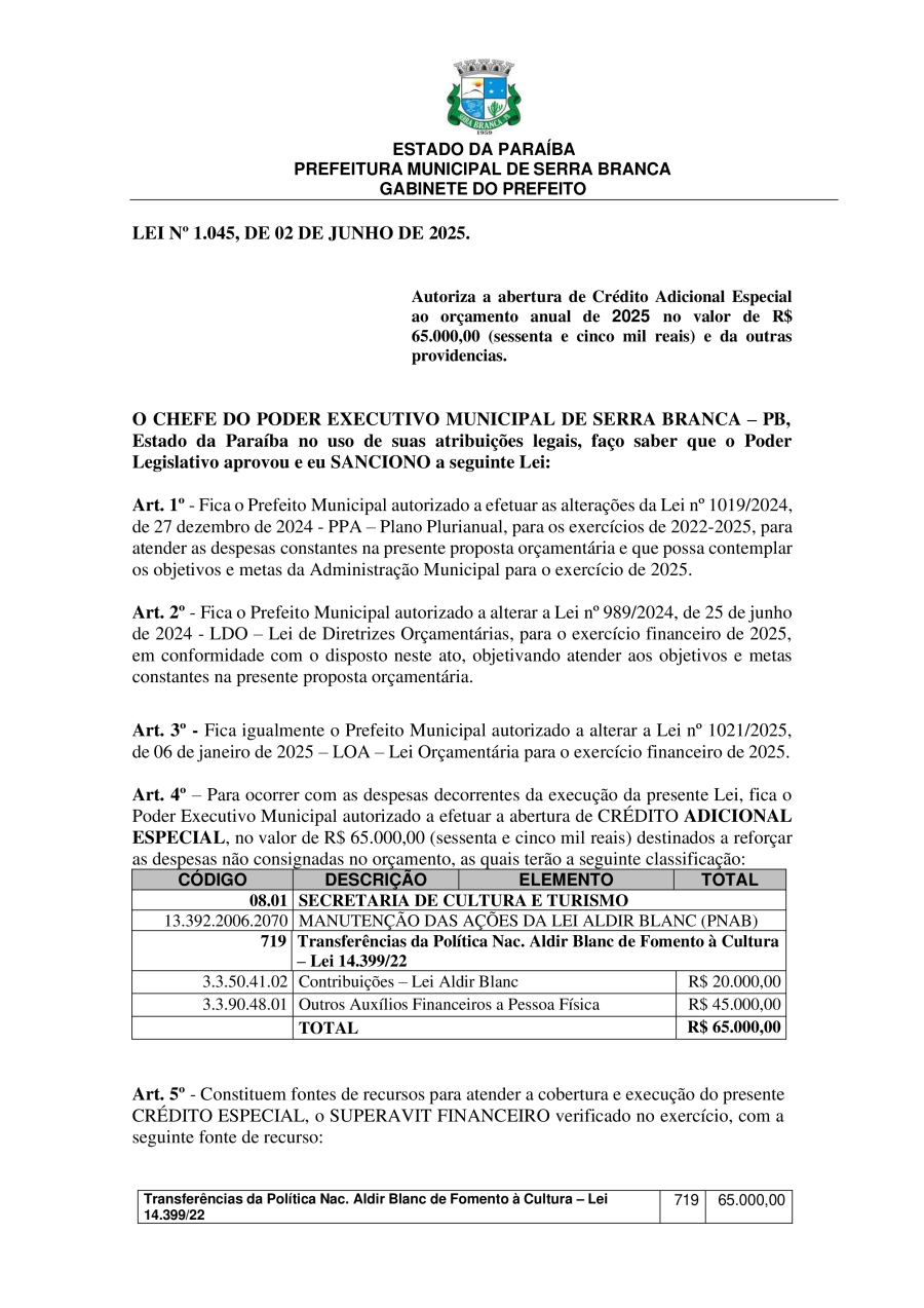 LEI N° 1045/2025 - AUTORIZA A ABERTURA DE CRÉDITO ADICIONAL ESPECIAL AO ORÇAMENTO ANUAL DE 2025