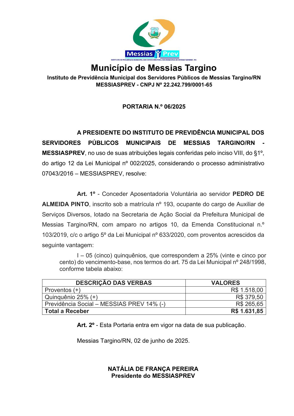 PORTARIA N.º 06/2025 - MESSIASPREV
