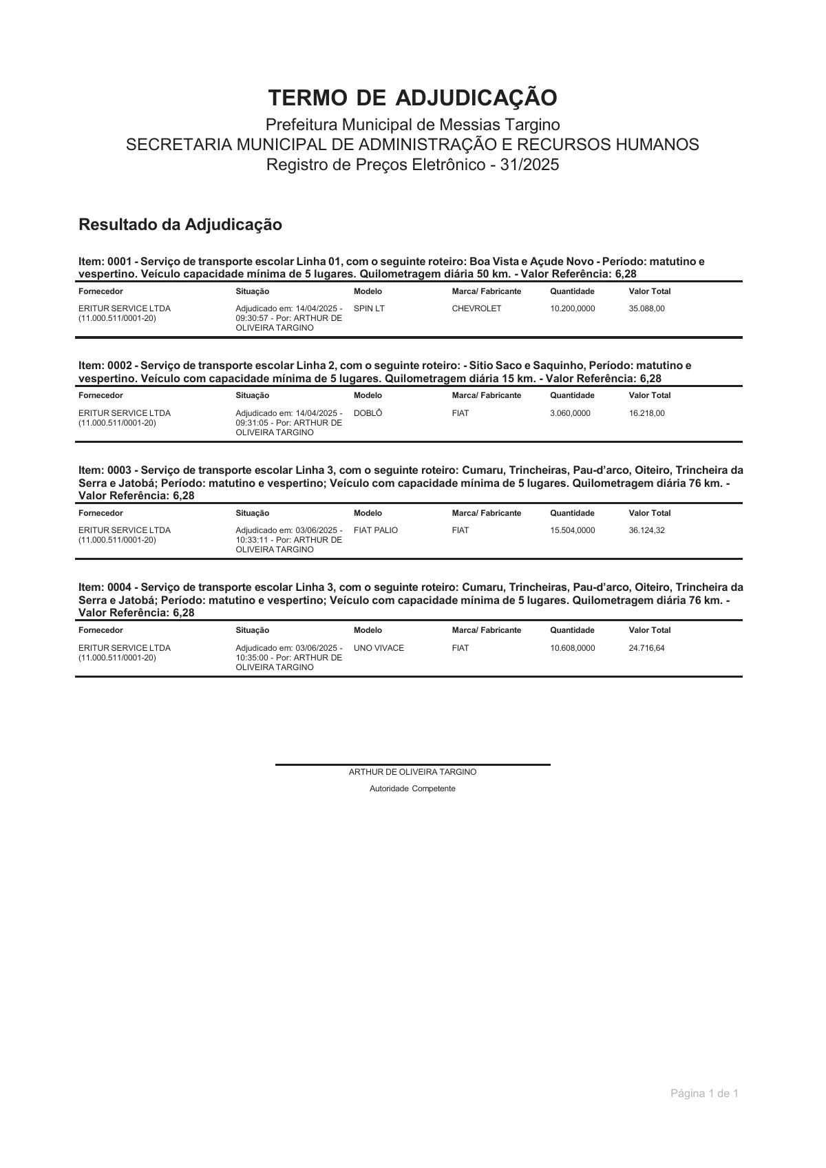 Conforme MP n° 2.200-2 de 24/08/2001, que institui a infraestrutura de chaves Públicas. Matéria Publicada no Diário Oficial do Município de Messias Targino/RN no dia - Edição 01300.
