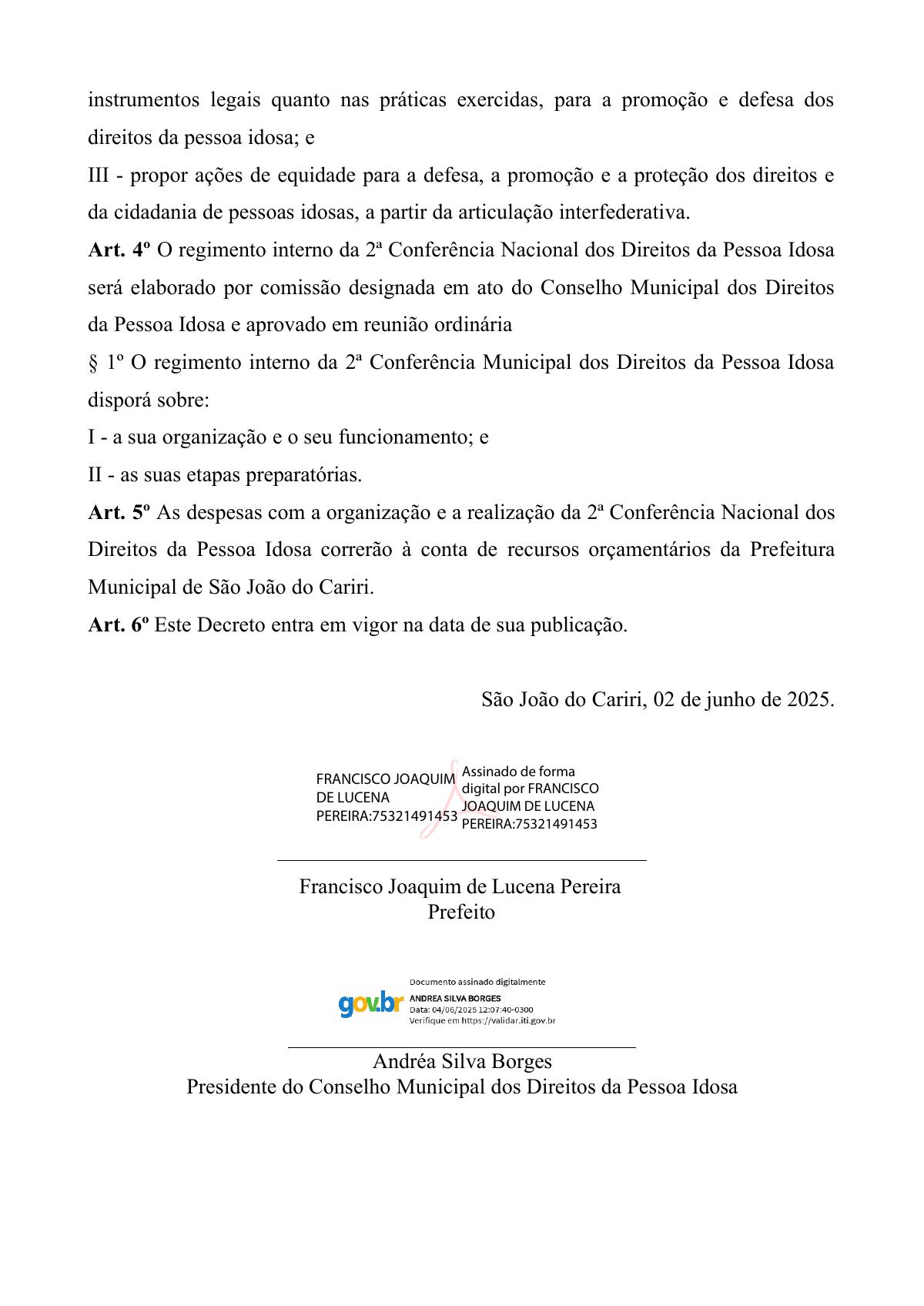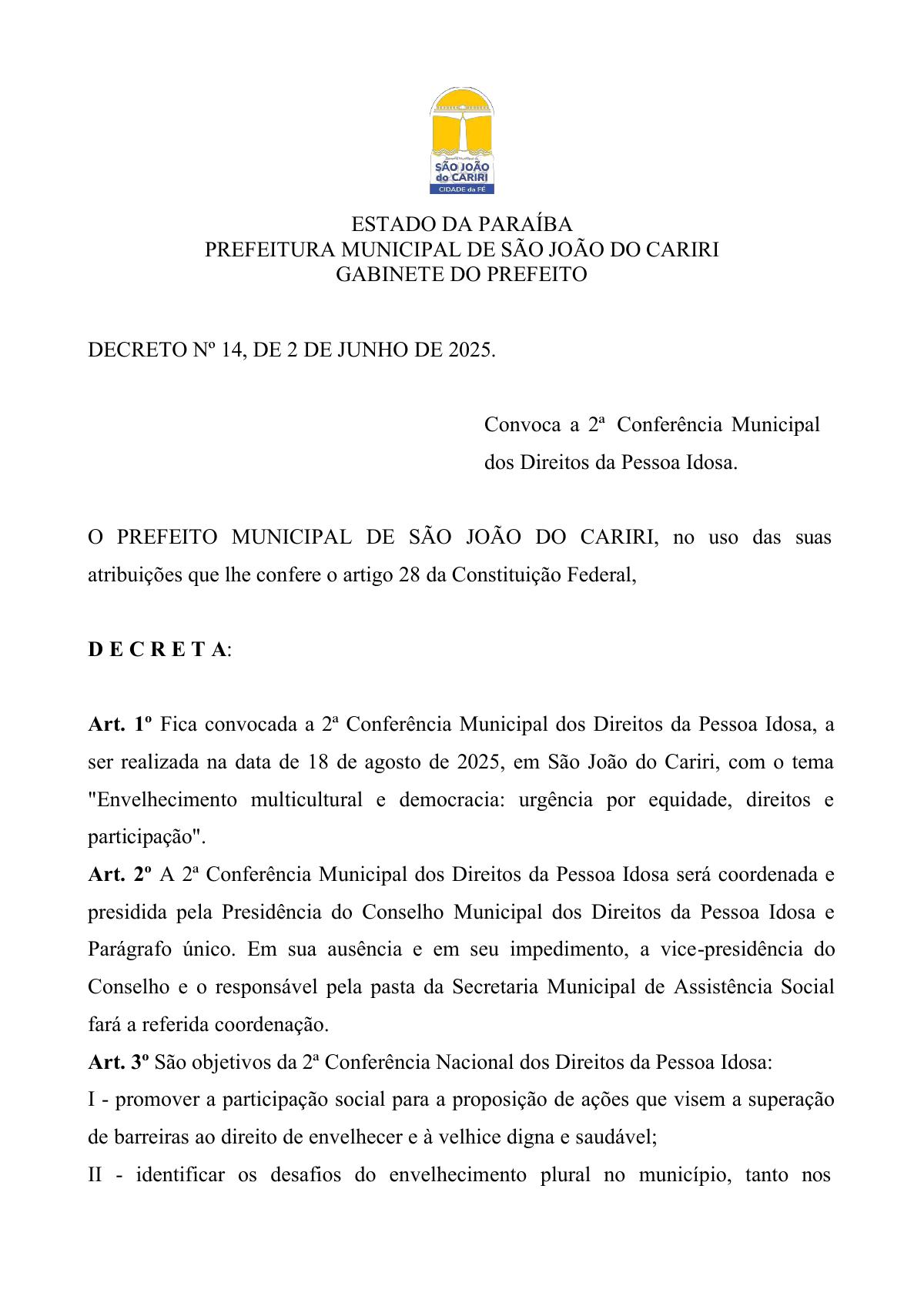 DECRETO Nº 14/2025 - CONVOCA A 2ª CONFERÊNCIA MUNICIPAL DOS DIREITOS DA PESSOA IDOSA.