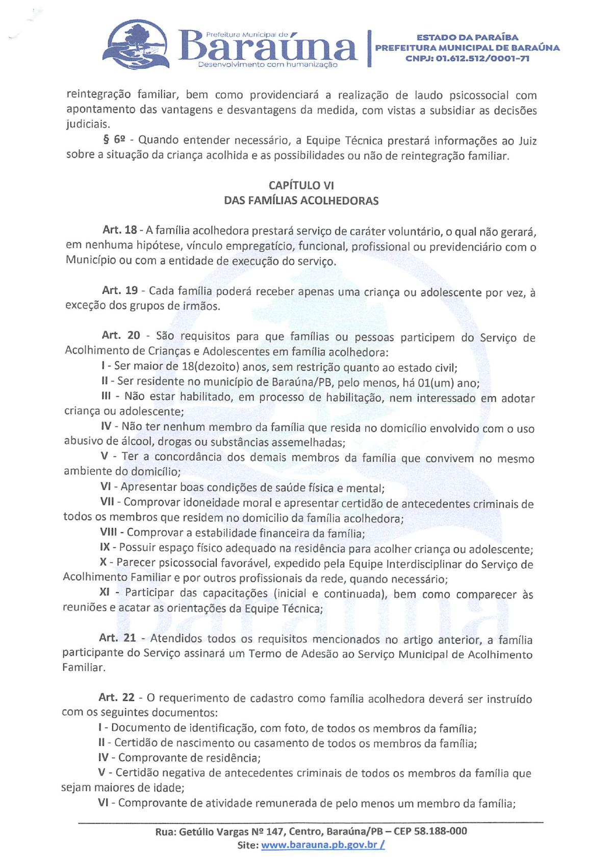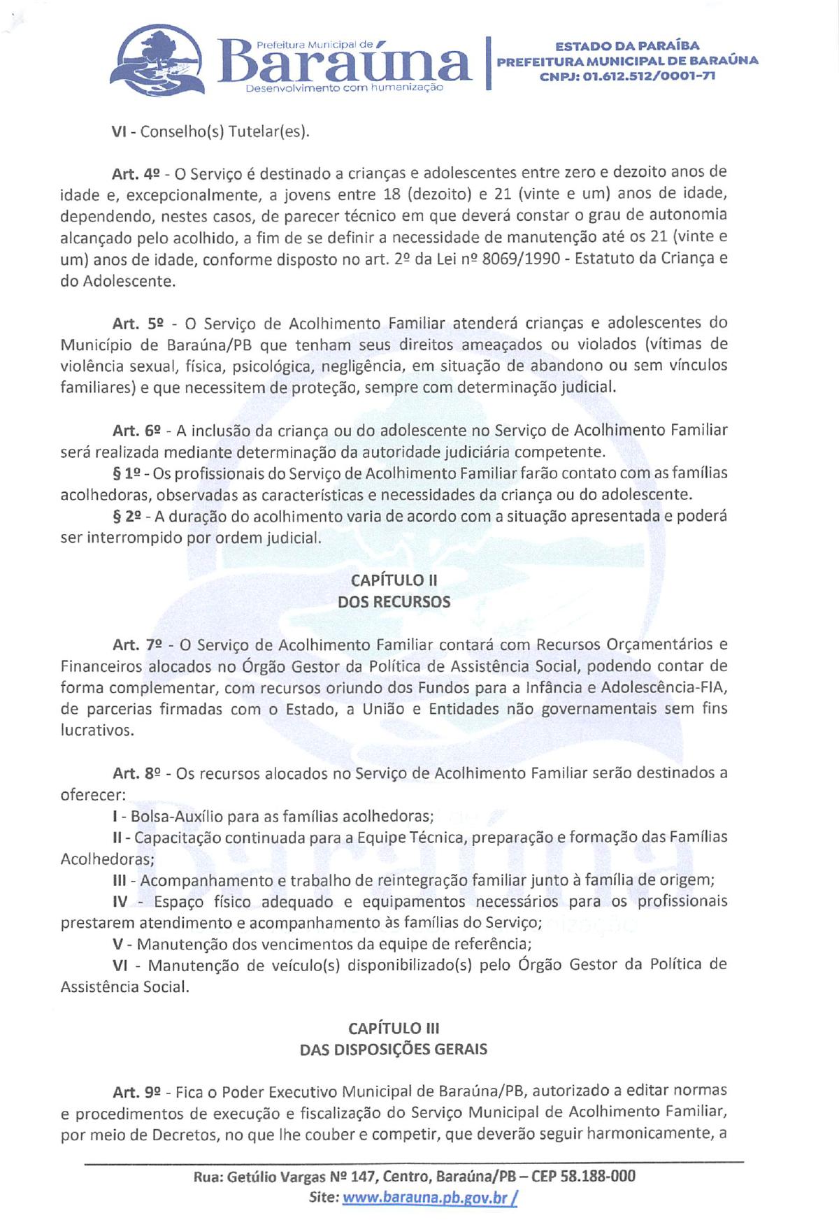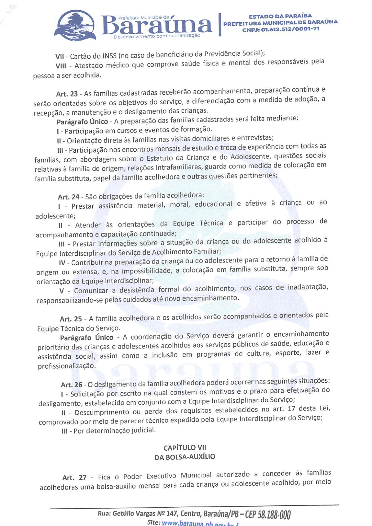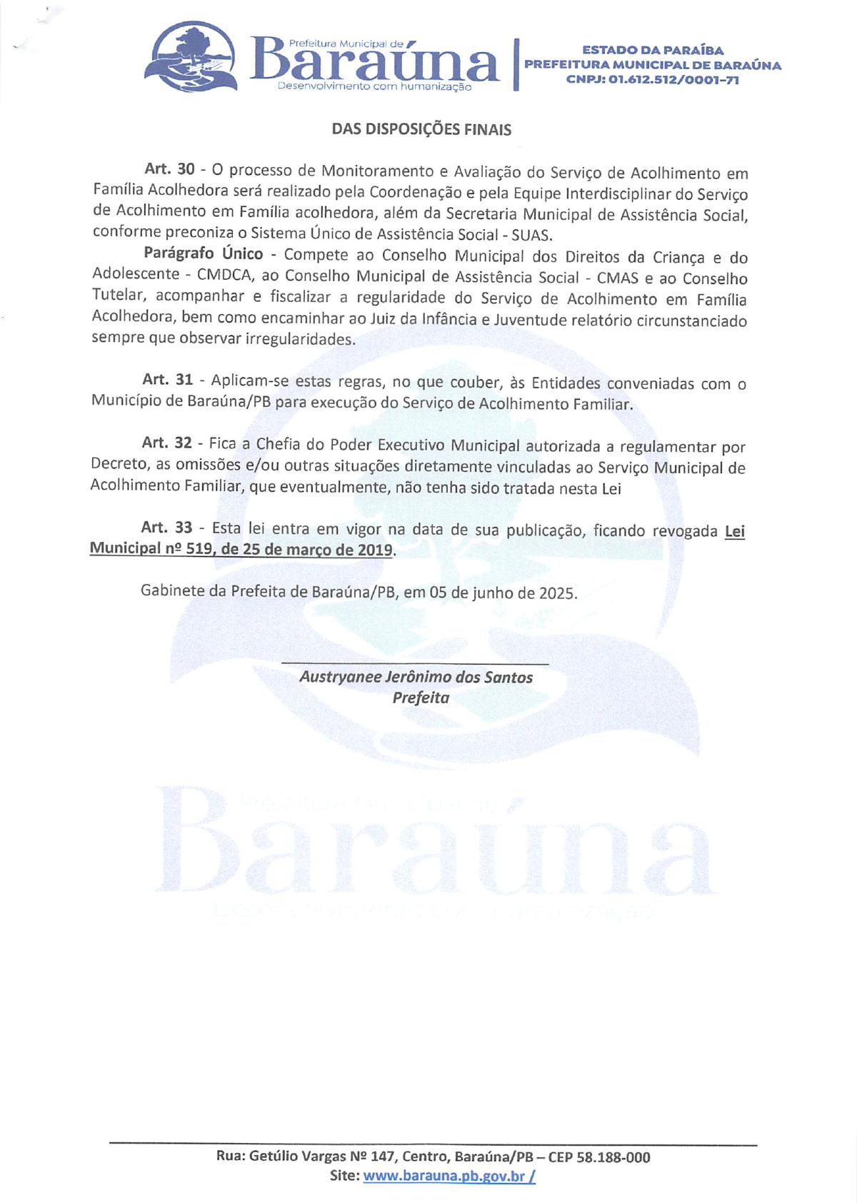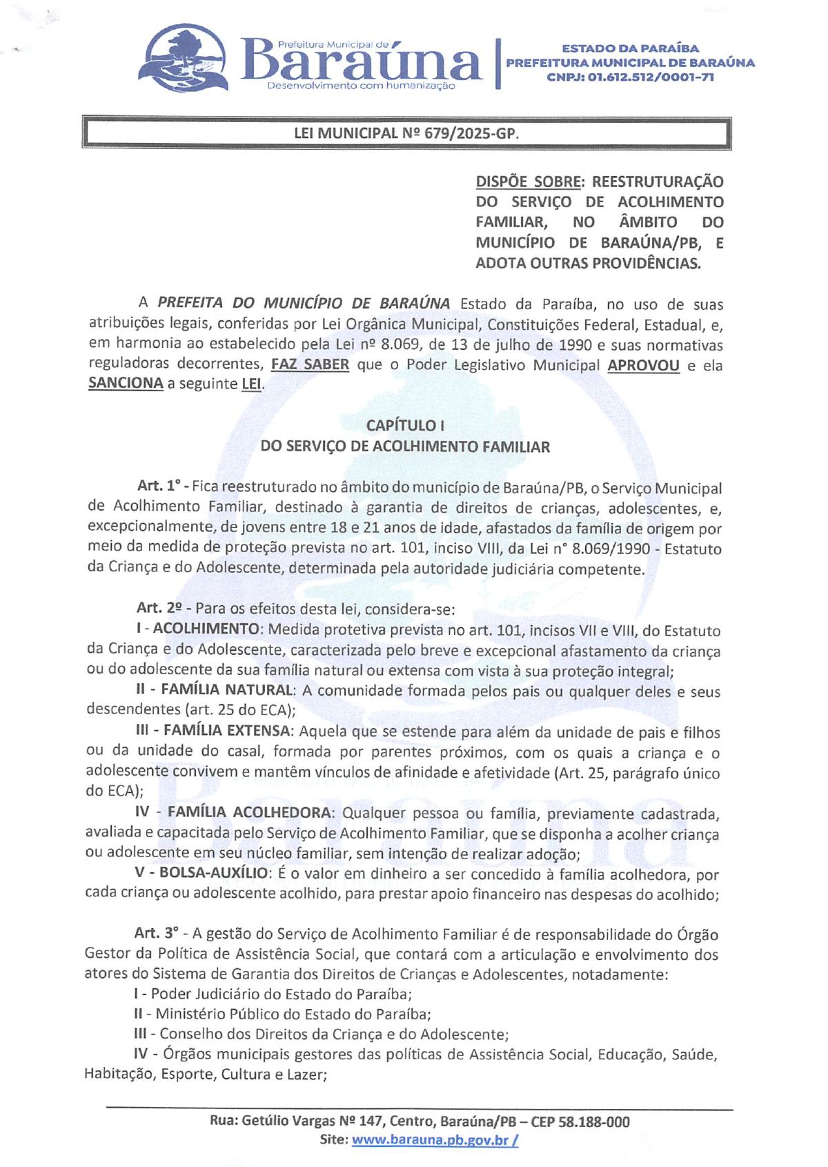 LEI MUNICIPAL Nº 679/2025-GP - DISPÕE SOBRE: REESTRUTURAÇÃO DO SERVIÇO DE ACOLHIMENTO FAMILIAR, NO ÂMBITO DO MUNICIPIO DE BARAÚNA/PB, E ADOTA OUTRAS PROVIDÊNCIAS. - 05 DE JUNHO DE 2025.