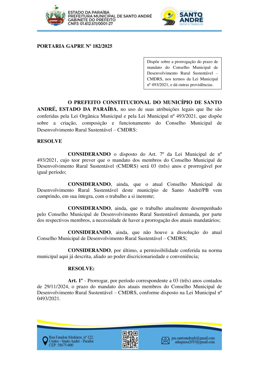 PORTARIA GAPRE Nº 182/2025 - DISPÕE SOBRE A PRORROGAÇÃO DO PRAZO DE MANDATO DO CONSELHO MUNICIPAL DE DESENVOLVIMENTO RURAL SUSTENTÁVEL – CMDRS, NOS TERMOS DA LEI MUNICIPAL Nº 493/2021, E DÁ OUTRAS PROVIDÊNCIAS.
