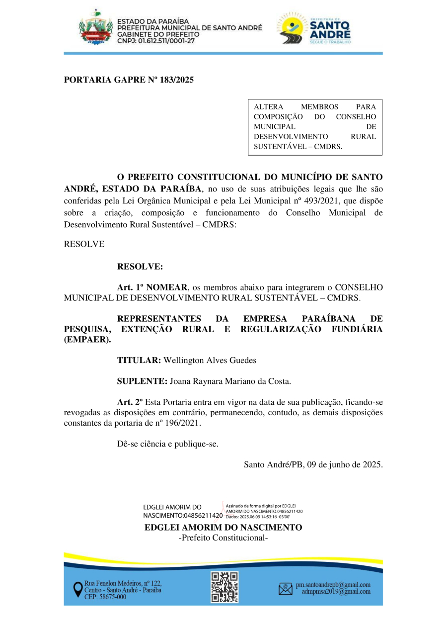 PORTARIA GAPRE Nº 183/2025 - ALTERA MEMBROS PARA COMPOSIÇÃO DO CONSELHO MUNICIPAL DE DESENVOLVIMENTO RURAL SUSTENTÁVEL – CMDRS.
