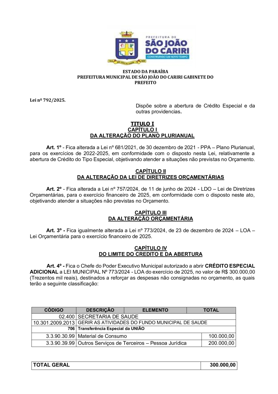 LEI 792/2025 - DISPÕE SOBRE A ABERTURA DE CRÉDITO ESPECIAL E DA OUTRAS PROVIDENCIAS.