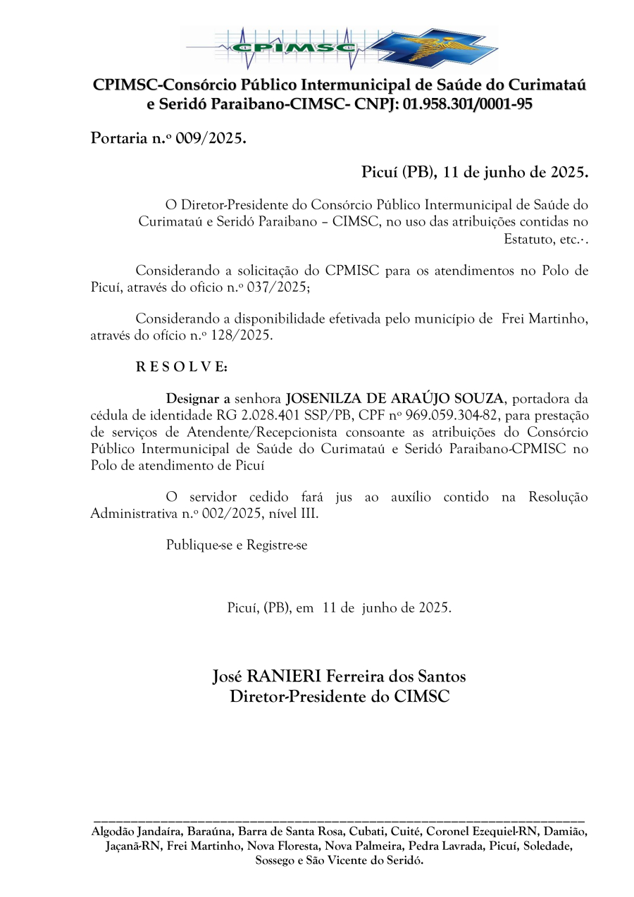 PORTARIA N° 0009/2025 - DESIGNAR A SENHORA JOSENILZA DE ARAÚJO SOUZA