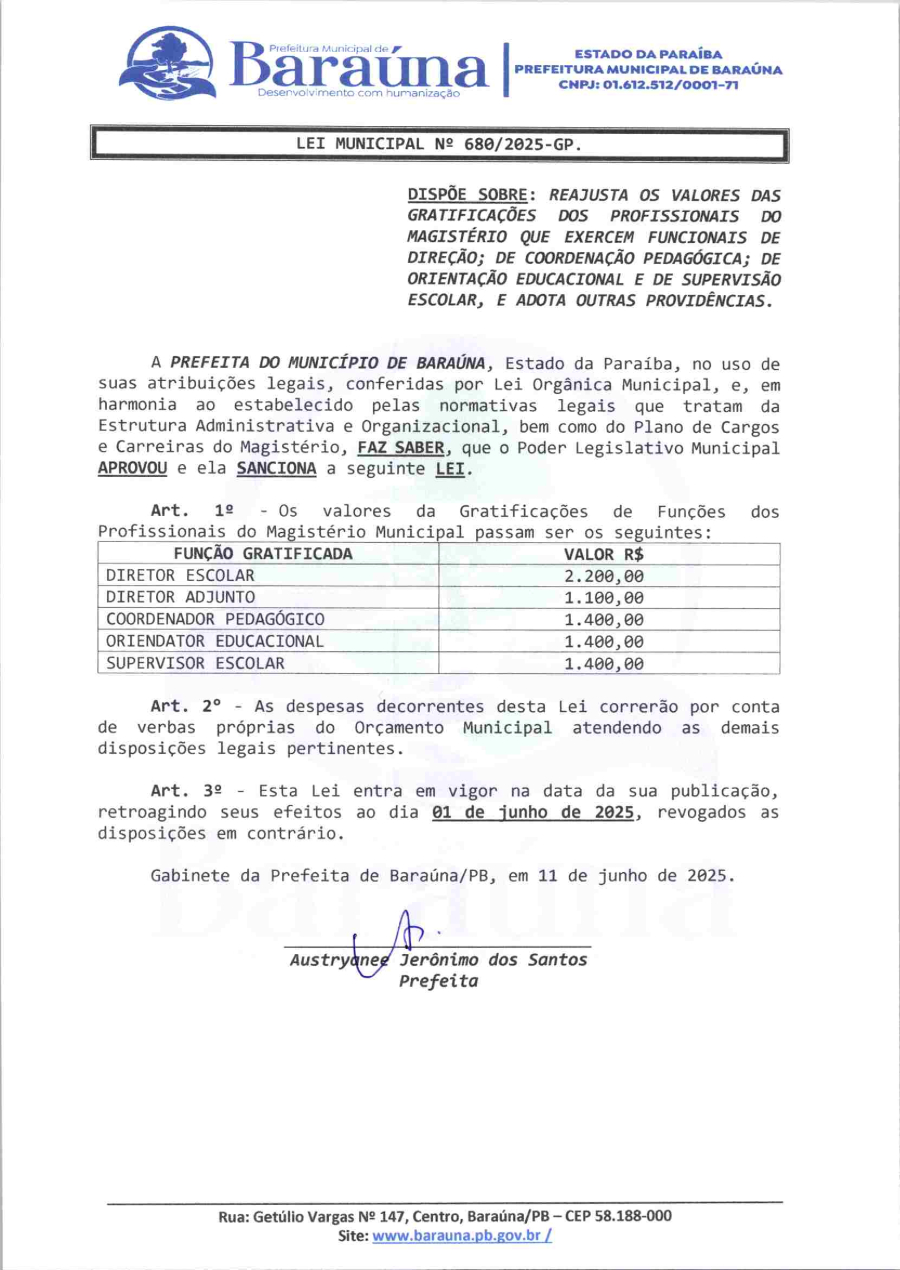 LEI MUNICIPAL Nº 680/2025-GP - DISPÕE SOBRE: REAJUSTA OS VALORES DAS GRATIFICAÇÕES DOS PROFISSIONAIS DO MAGISTÉRIO QUE EXERCEM FUNCIONAIS DE DIREÇÃO; DE COORDENAÇÃO PEDAGÓGICA; DE ORIENTAÇÃO EDUCACIONAL E DE SUPERVISÃO ESCOLAR, E ADOTA OUTRAS PROVIDÊNCIAS. - 11 DE JUNHO DE 2025.