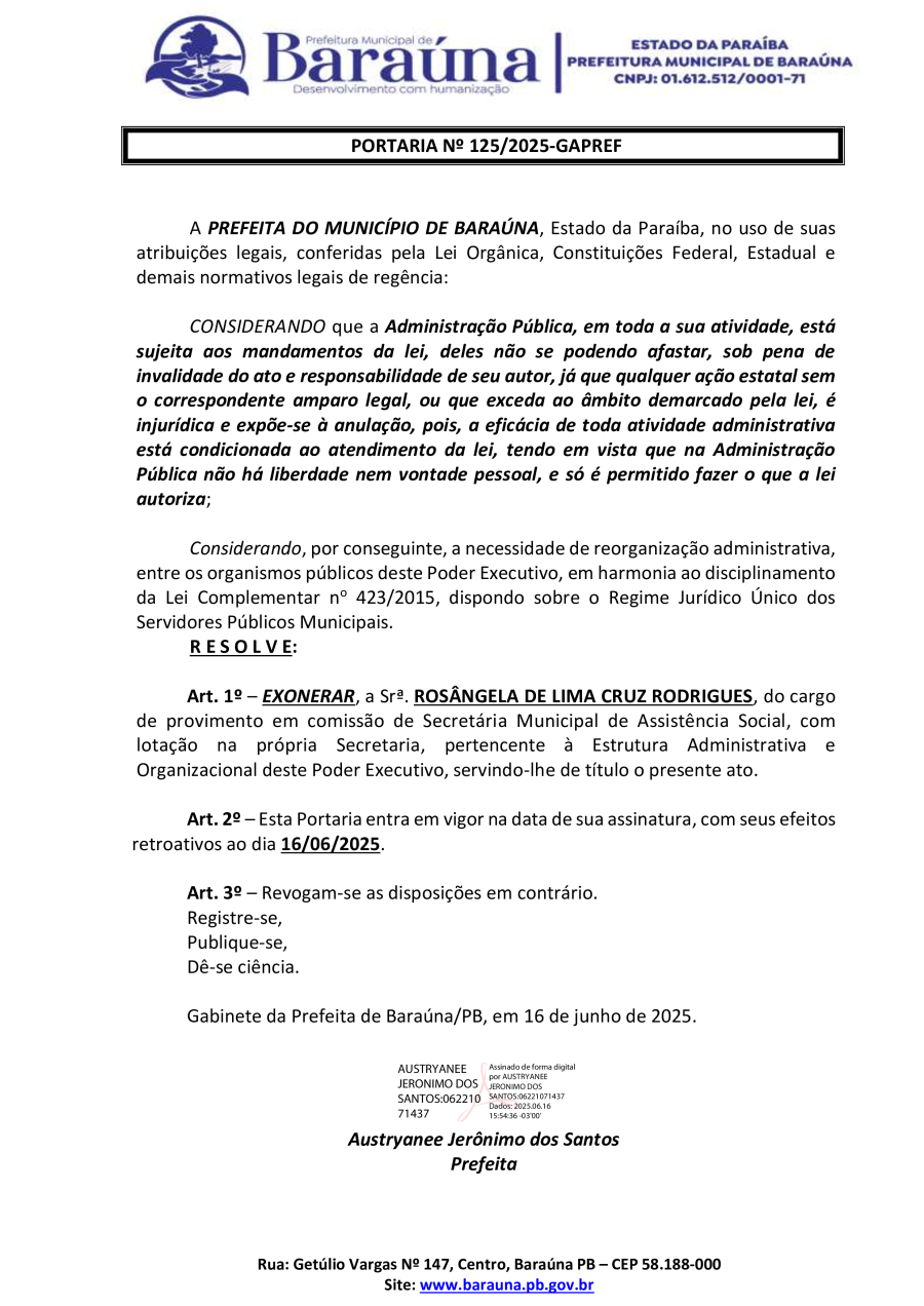 PORTARIA Nº 125/2025-GAPREF - EXONERAR A SRª ROSANGELA DE LIMA CRUZ RODRIGUES DO CARGO DE PROVIMENTO EM COMISSÃO DE SECRETÁRIA MUNICIPAL DE ASSISTÊNCIA SOCIAL. - 17 DE JUNHO DE 2025.
