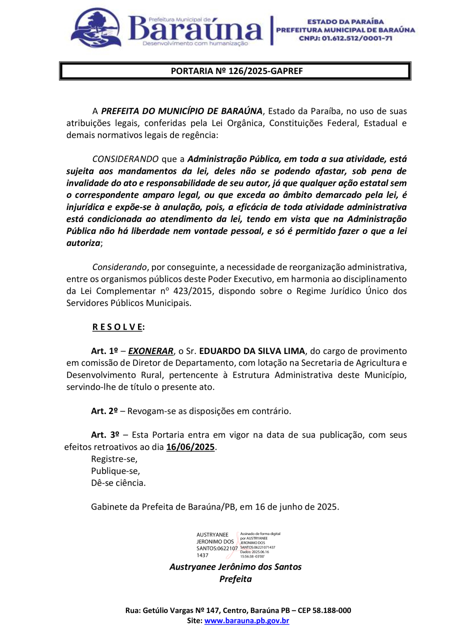 PORTARIA Nº 126/2025-GAPREF - EXONERAR O SR. EDUARDO DA SIÇLVA LIMA, DO CARGO DE PROVIMENTO EM COMISSÃO DE DIRETOR DE DEPARTAMENTO. - 17 DE JUNHO DE 2025.