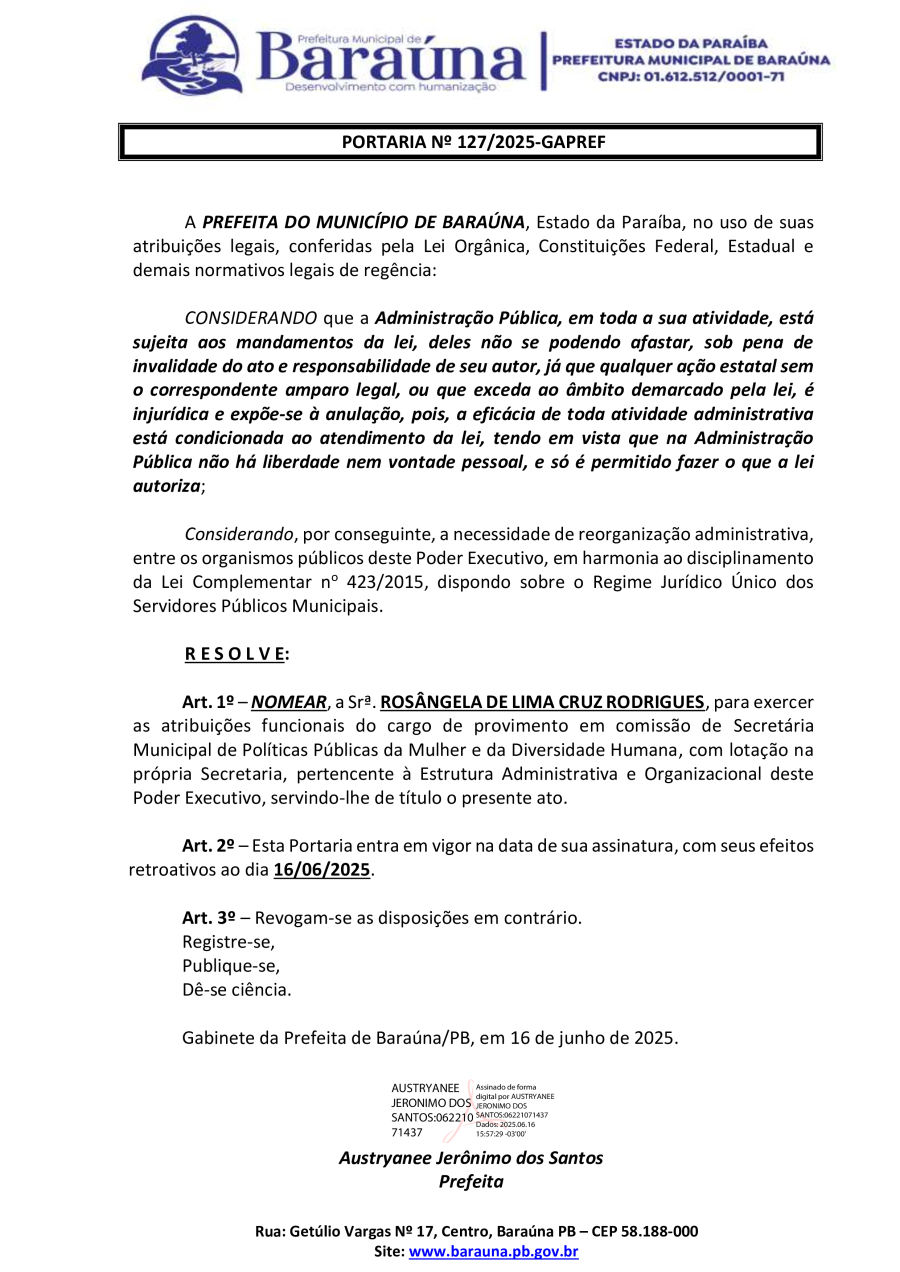 PORTARIA Nº 127/2025-GAPREF - NOMEAR A SRª ROSANGELA DE LIMA CRUZ RODRIGUES. - 17 DE JUNHO DE 2025.