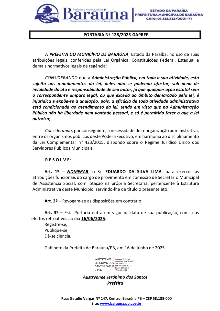 PORTARIA Nº 128/2025-GAPREF. - NOMEAR O SR. EDUARDO DA SILVA LIMA. - 17 DE JUNHO DE 2025.
