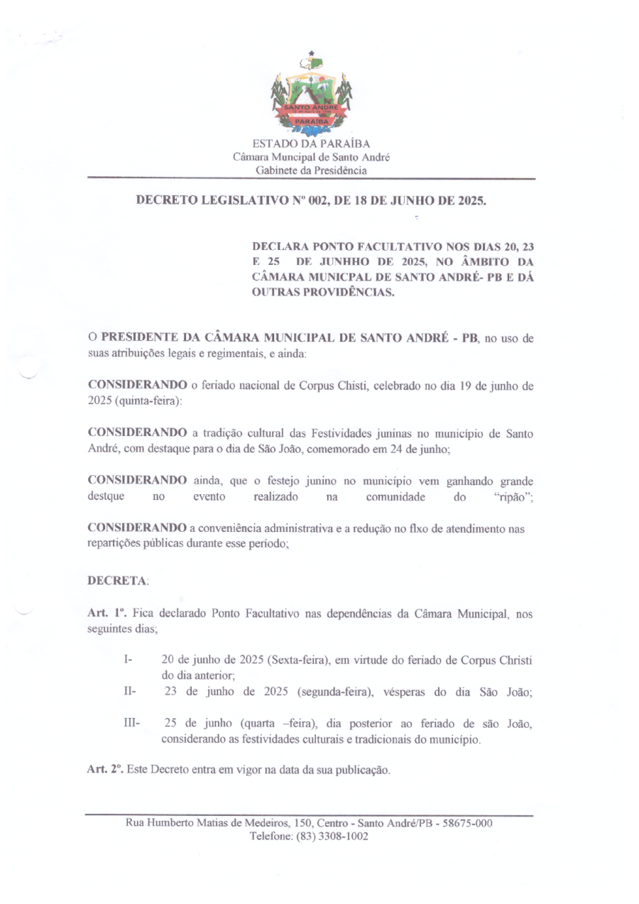 DECRETO LEGISLATIVO N° 0002/2025 - DECLARA PONTO FACULTATIVO NOS DIAS 20 23 E 25 DE JUNHO DE 2025