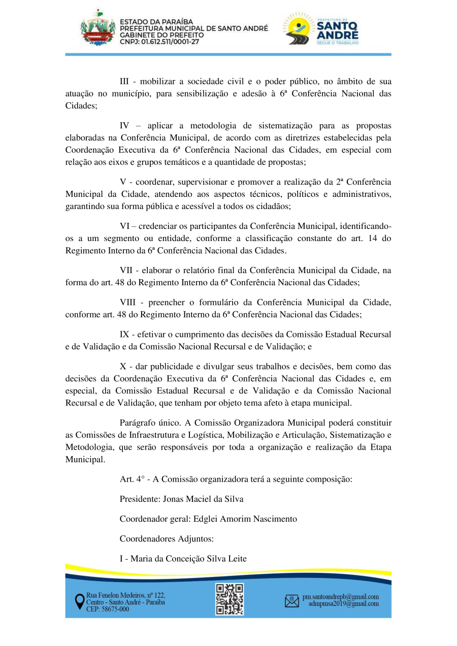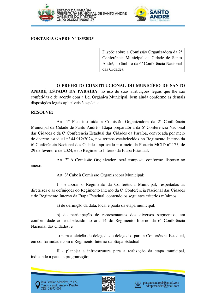 PORTARIA GAPRE Nº 185/2025 - DISPÕE SOBRE A COMISSÃO ORGANIZADORA DA 2ª CONFERÊNCIA MUNICIPAL DA CIDADE DE SANTO ANDRÉ, NO ÂMBITO DA 6ª CONFERÊNCIA NACIONAL DAS CIDADES.
