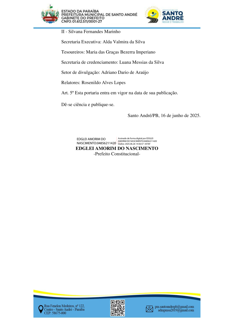 Conforme MP n° 2.200-2 de 24/08/2001, que institui a infraestrutura de chaves Públicas. Matéria Publicada no Diário Oficial do Município de Santo André/PB no dia - Edição 01242.
