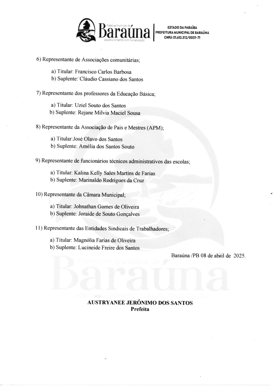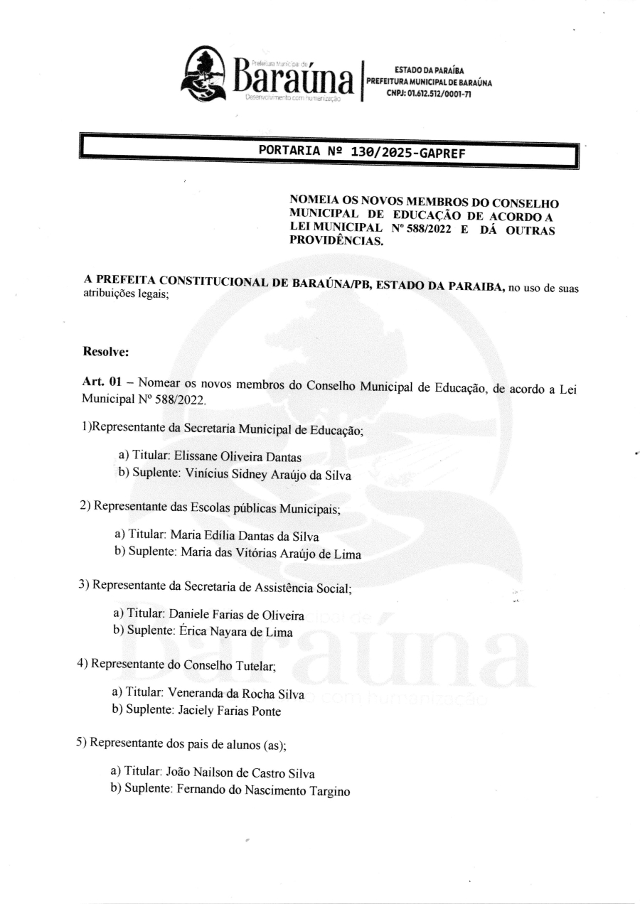 RETIFICAÇÃO - PORTARIA 130/2025-GAPREF - NOMEAR OS MEMBROS QUE COMPORÃO A COMISSÃO ORGANIZADORA DA 1ª CONFERENCIA DA CIDADE DE BARAÚNA/PB. - 26 DE JUNHO DE 2025.