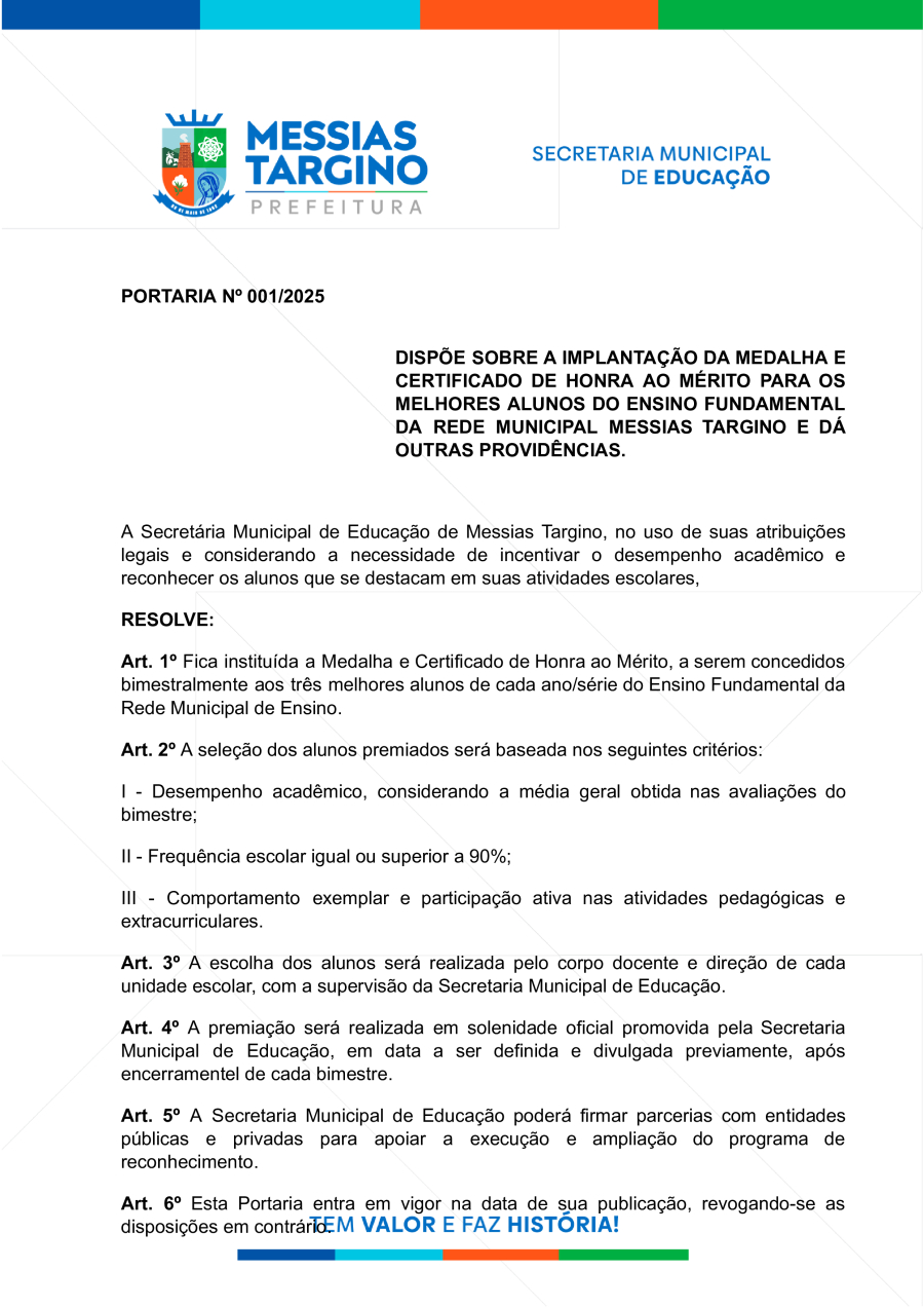 PORTARIA N°001 - DISPÕE SOBRE A IMPLANTAÇÃO DA MEDALHA E CERTIFICADO DE HONRA AO MÉRITO PARA OS MELHORES ALUNOS DO ENSINO FUNDAMENTAL DA REDE MUNICIPAL.