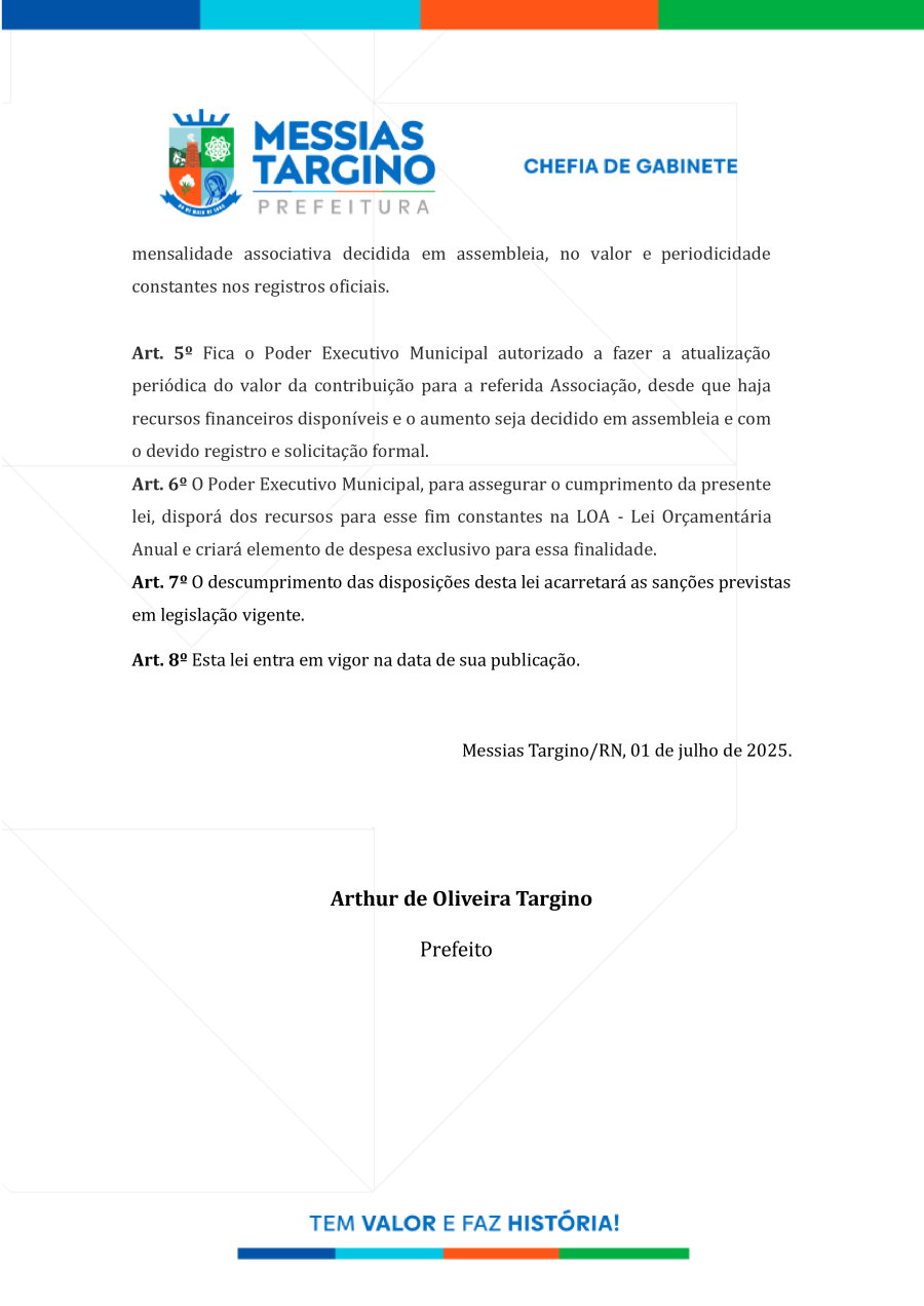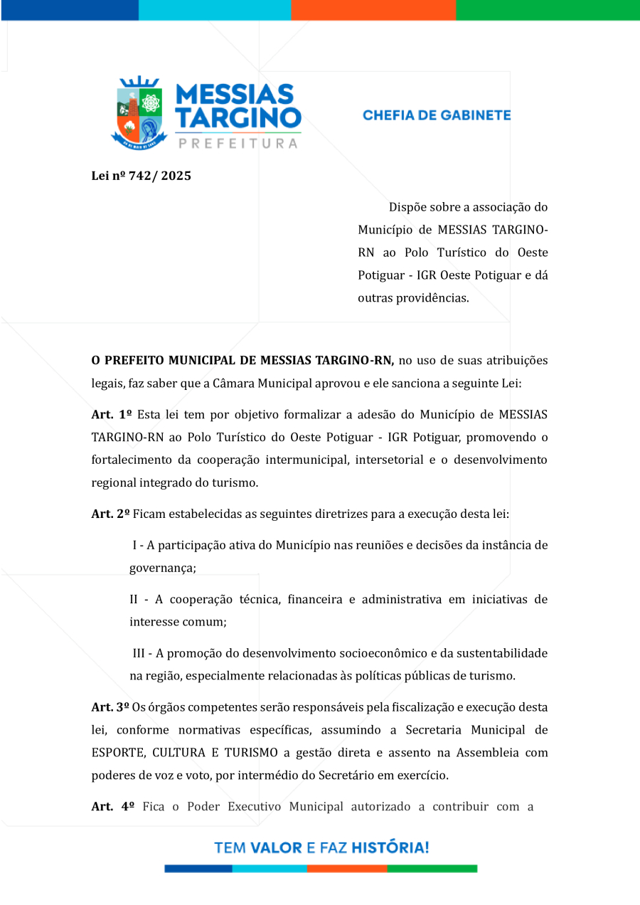 LEI N°742 - ASSOCIAÇÃO DO MUNICÍPIO DE MESSIAS TARGINO-RN AO POLO TURÍSTICO DO OESTE POTIGUAR - IGR OESTE POTIGUAR.