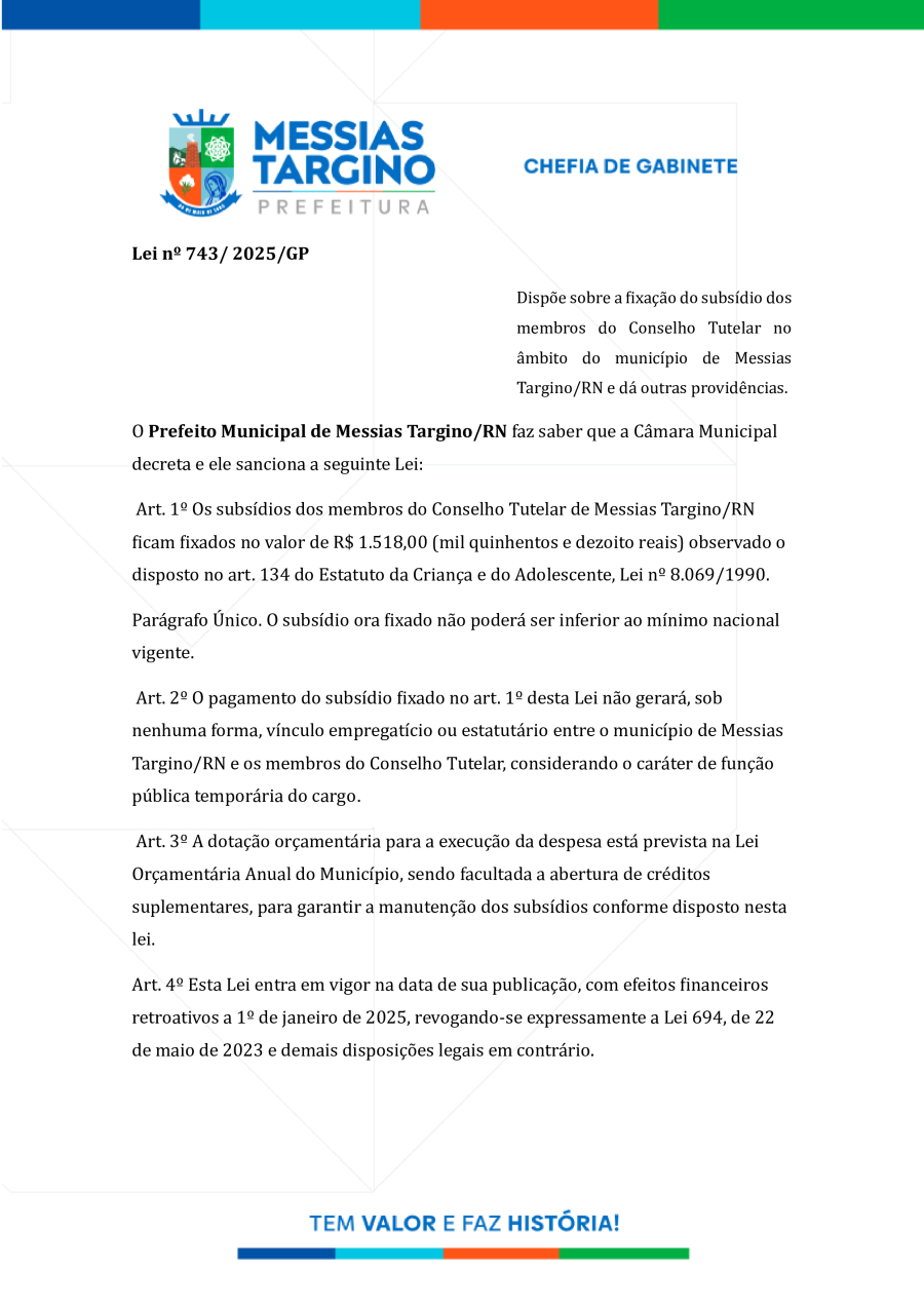 LEI N°743 - FIXAÇÃO DO SUBSÍDIO DOS MEMBROS DO CONSELHO TUTELAR NO ÂMBITO DO MUNICÍPIO DE MESSIAS TARGINO/RN.