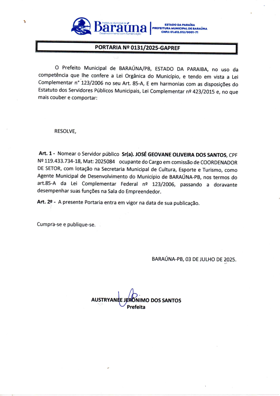 PORTARIA Nº 131/2025-GAPREF - NOMEAR O SERIDOR PÚBLICO SR(A) JOSE GEOVANE OLIVEIRA DOS SANTOS, COMO AGENTE MUNICIPAL DE DESENVOLVIMENTO DO MUNICIPIO DE BARAÚNA-PB. - 04 DE JULHO DE 2025.