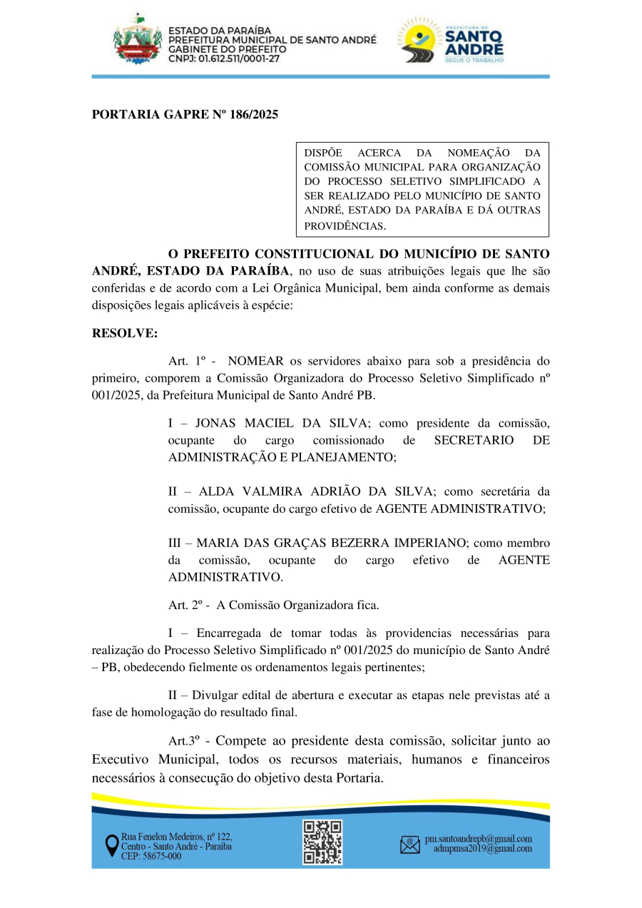 PORTARIA GAPRE Nº 186/2025 - DISPÕE ACERCA DA NOMEAÇÃO DA COMISSÃO MUNICIPAL PARA ORGANIZAÇÃO DO PROCESSO SELETIVO SIMPLIFICADO A SER REALIZADO PELO MUNICÍPIO DE SANTO ANDRÉ, ESTADO DA PARAÍBA E DÁ OUTRAS PROVIDÊNCIAS.