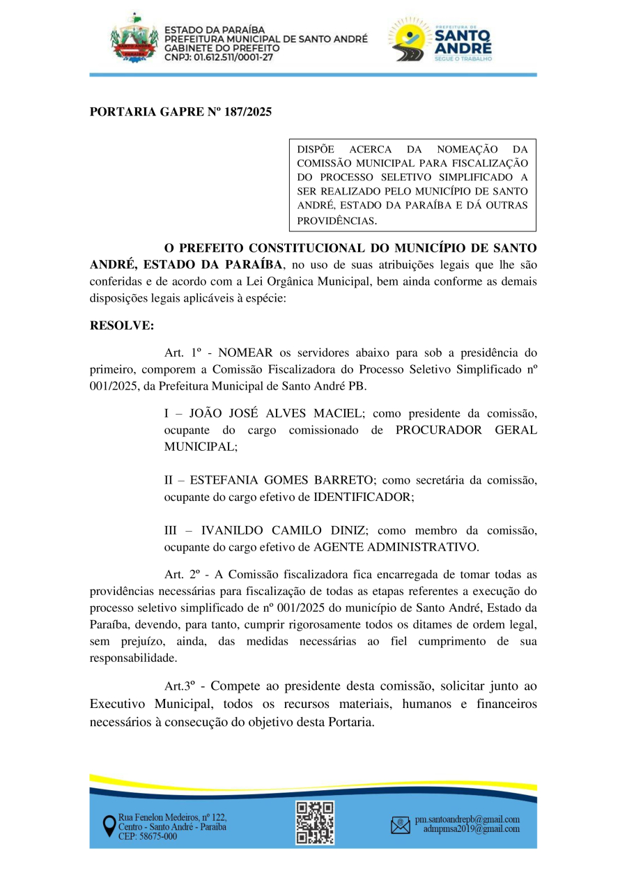 PORTARIA GAPRE Nº 187/2025 - DISPÕE ACERCA DA NOMEAÇÃO DA COMISSÃO MUNICIPAL PARA FISCALIZAÇÃO DO PROCESSO SELETIVO SIMPLIFICADO A SER REALIZADO PELO MUNICÍPIO DE SANTO ANDRÉ, ESTADO DA PARAÍBA E DÁ OUTRAS PROVIDÊNCIAS.