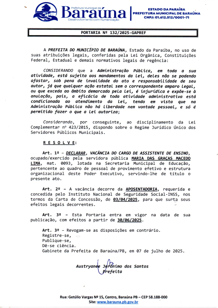 PORTARIA Nº 132/2025-GAPREF - DECLARAR, VACÂNCIA DO CARGO DE ASSISTENTE DE ENSINO MARIA DAS GRAÇAS MACEDO LIMA. - 07 DE JULHO DE 2025.