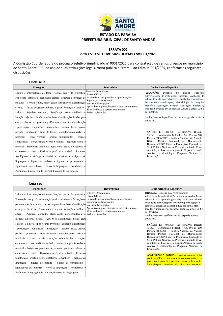 ERRATA 002 - PROCESSO SELETIVO SIMPLIFICADO Nº0001/2025