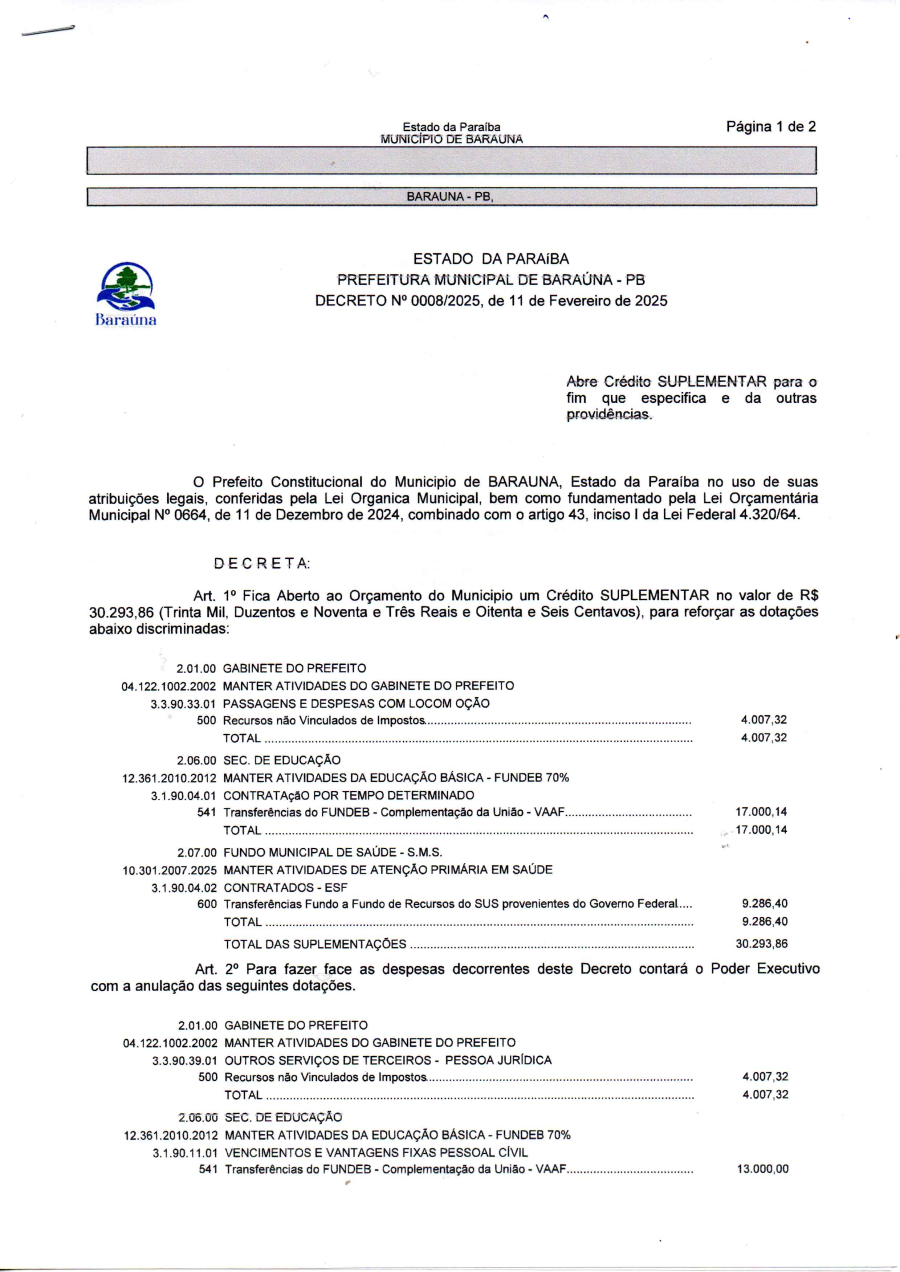 DECRETO Nº 008/2025 ABRE CREDITO SUPLEMENTAR PARA O FIM QUE ESPECIFICA E DA OUTRAS PROVIDÊNCIAS. - 16 DE JULHO DE 2025.