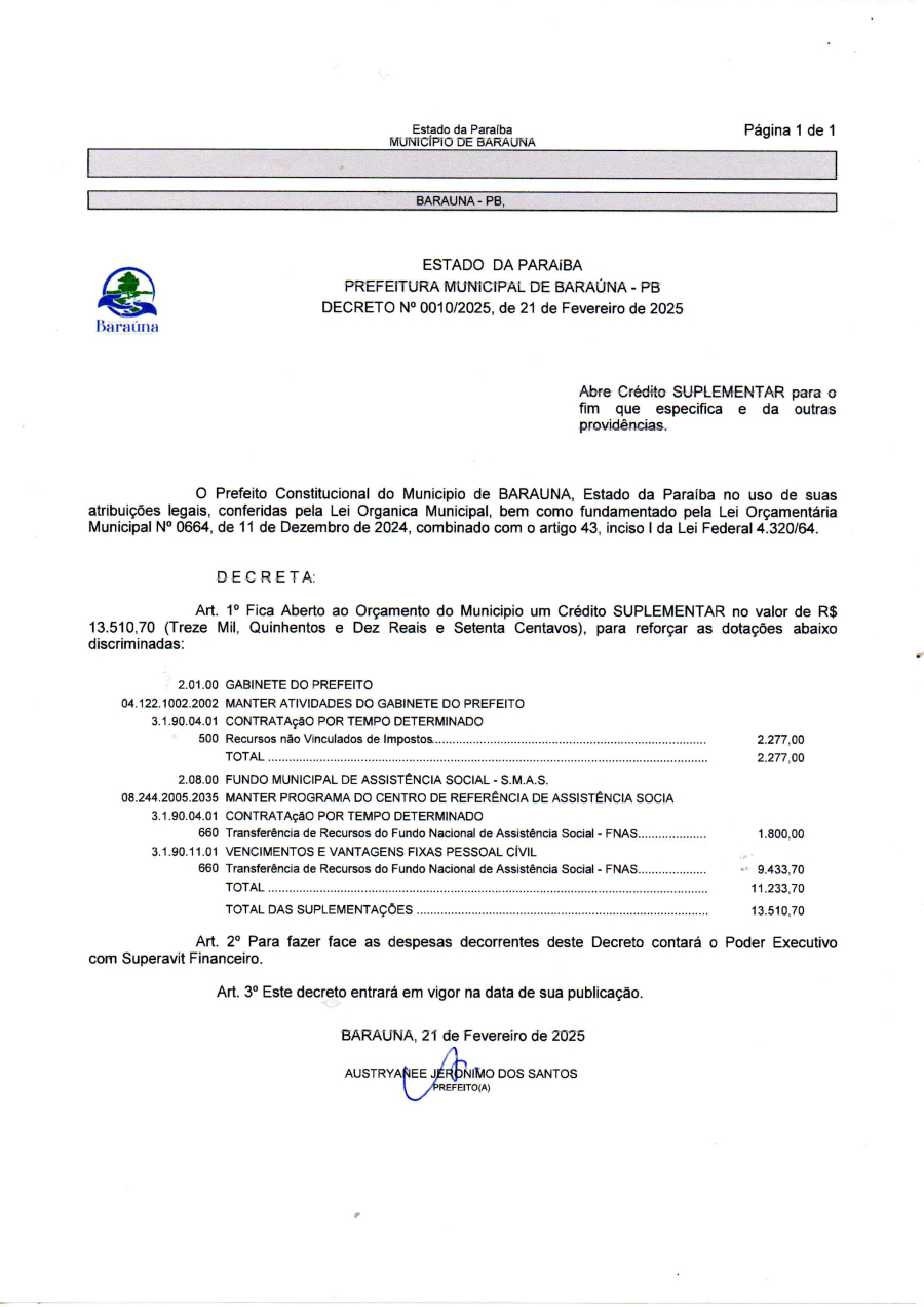 DECRETO Nº 010/2025 ABRE CREDITO SUPLEMENTAR PARA O FIM QUE ESPECIFICA E DA OUTRAS PROVIDÊNCIAS. - 16 DE JULHO DE 2025.