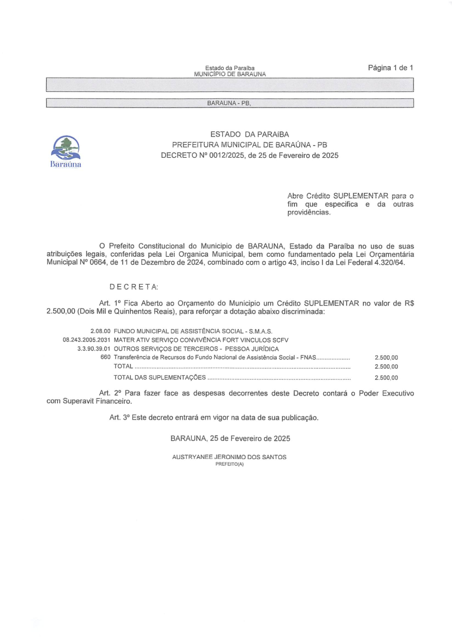 DECRETO Nº 012/2025 ABRE CREDITO SUPLEMENTAR PARA O FIM QUE ESPECIFICA E DA OUTRAS PROVIDÊNCIAS. - 16 DE JULHO DE 2025.