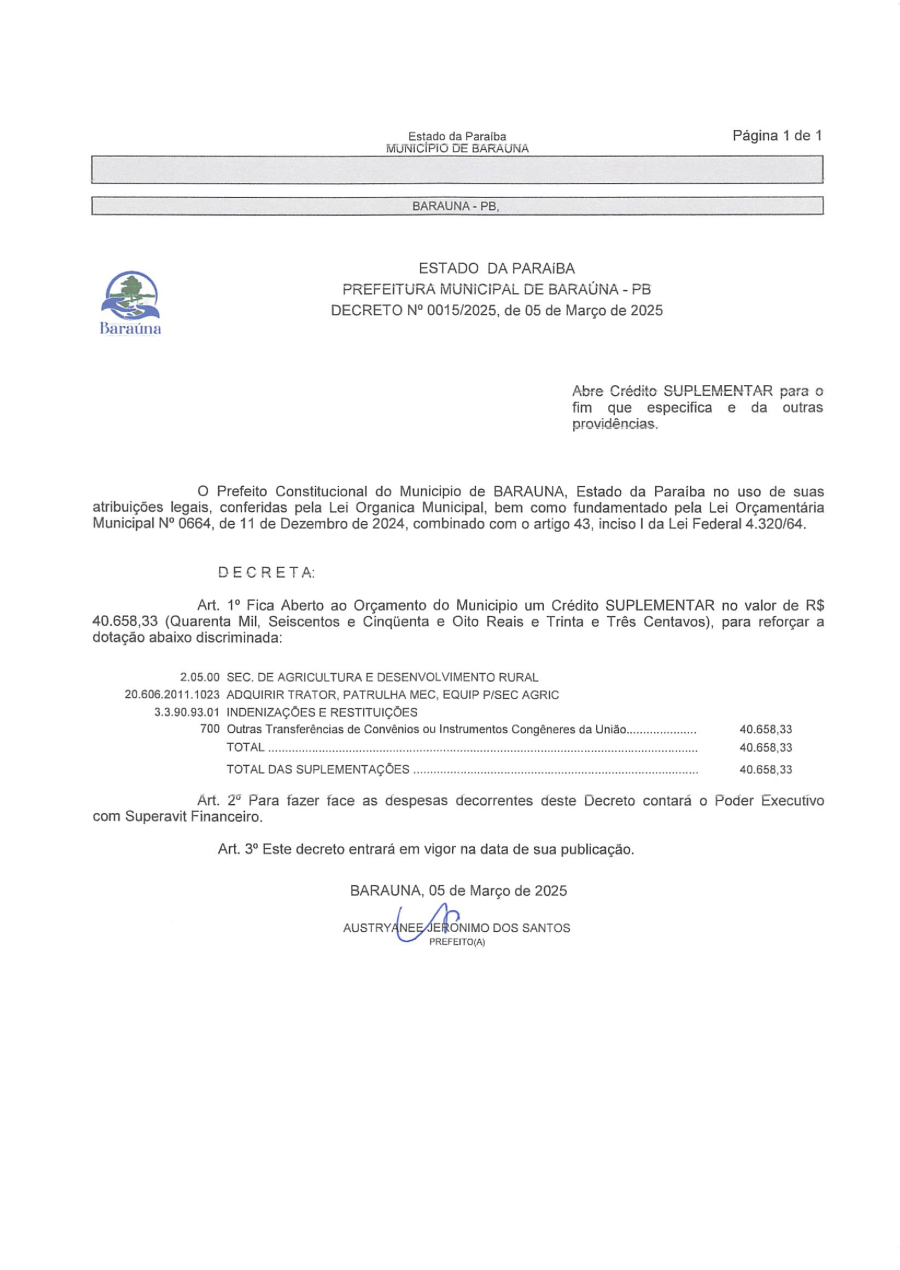 DECRETO Nº 015/2025 ABRE CREDITO SUPLEMENTAR PARA O FIM QUE ESPECIFICA E DA OUTRAS PROVIDÊNCIAS. - 16 DE JULHO DE 2025.