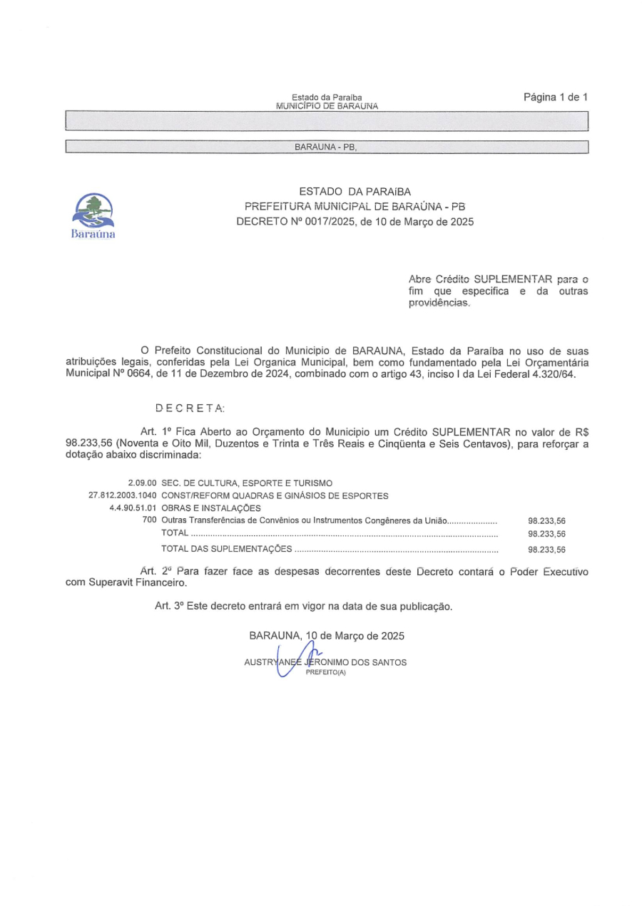 DECRETO Nº 017/2025 ABRE CREDITO SUPLEMENTAR PARA O FIM QUE ESPECIFICA E DA OUTRAS PROVIDÊNCIAS. - 16 DE JULHO DE 2025.