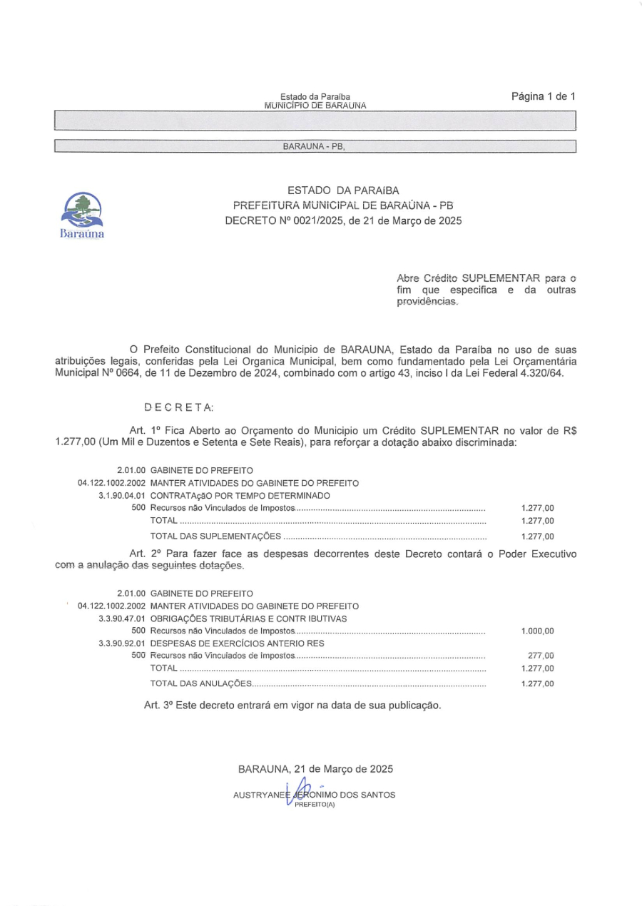 DECRETO Nº 021/2025 ABRE CREDITO SUPLEMENTAR PARA O FIM QUE ESPECIFICA E DA OUTRAS PROVIDÊNCIAS. - 16 DE JULHO DE 2025.