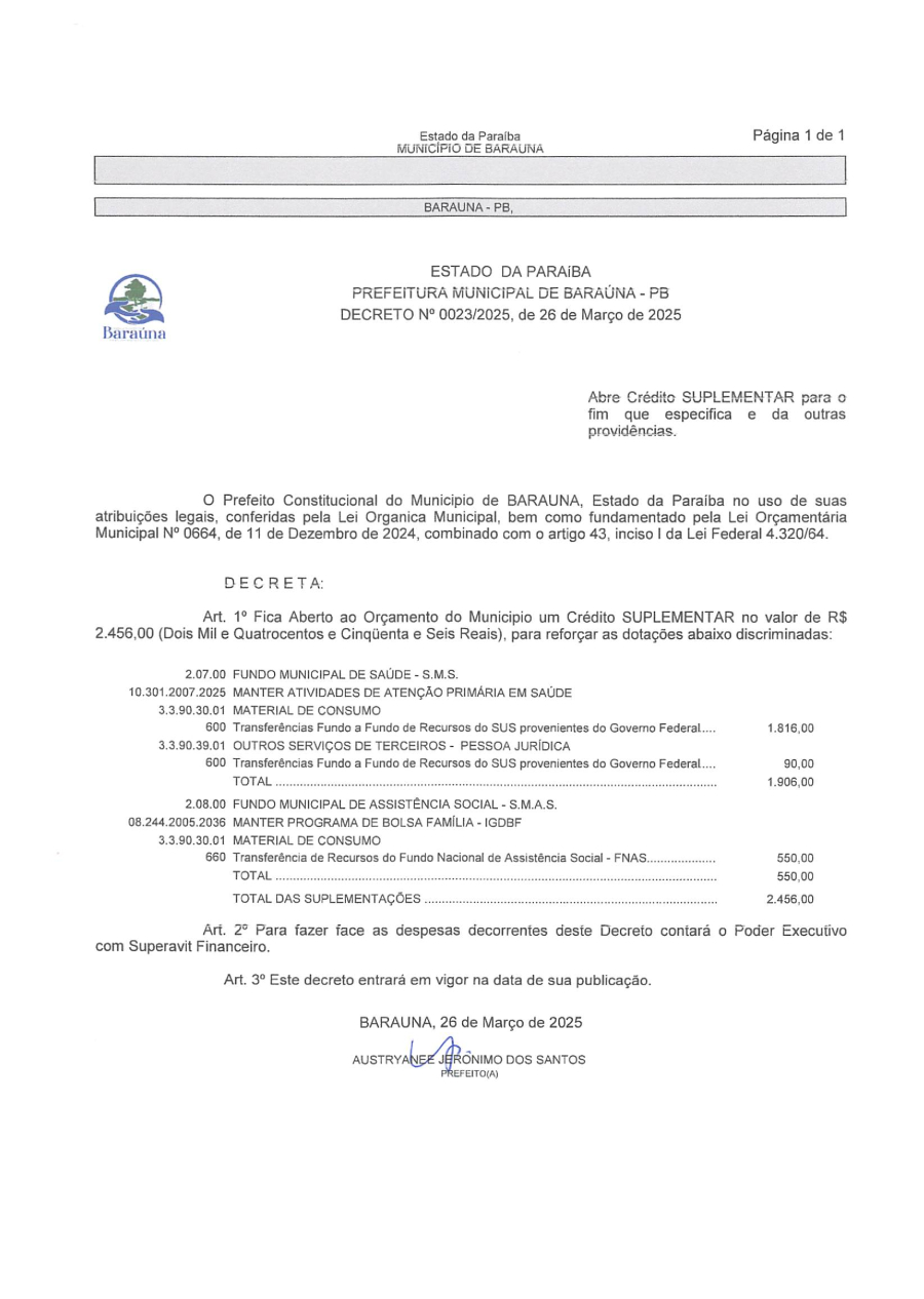 DECRETO Nº 023/2025 ABRE CREDITO SUPLEMENTAR PARA O FIM QUE ESPECIFICA E DA OUTRAS PROVIDÊNCIAS. - 16 DE JULHO DE 2025.