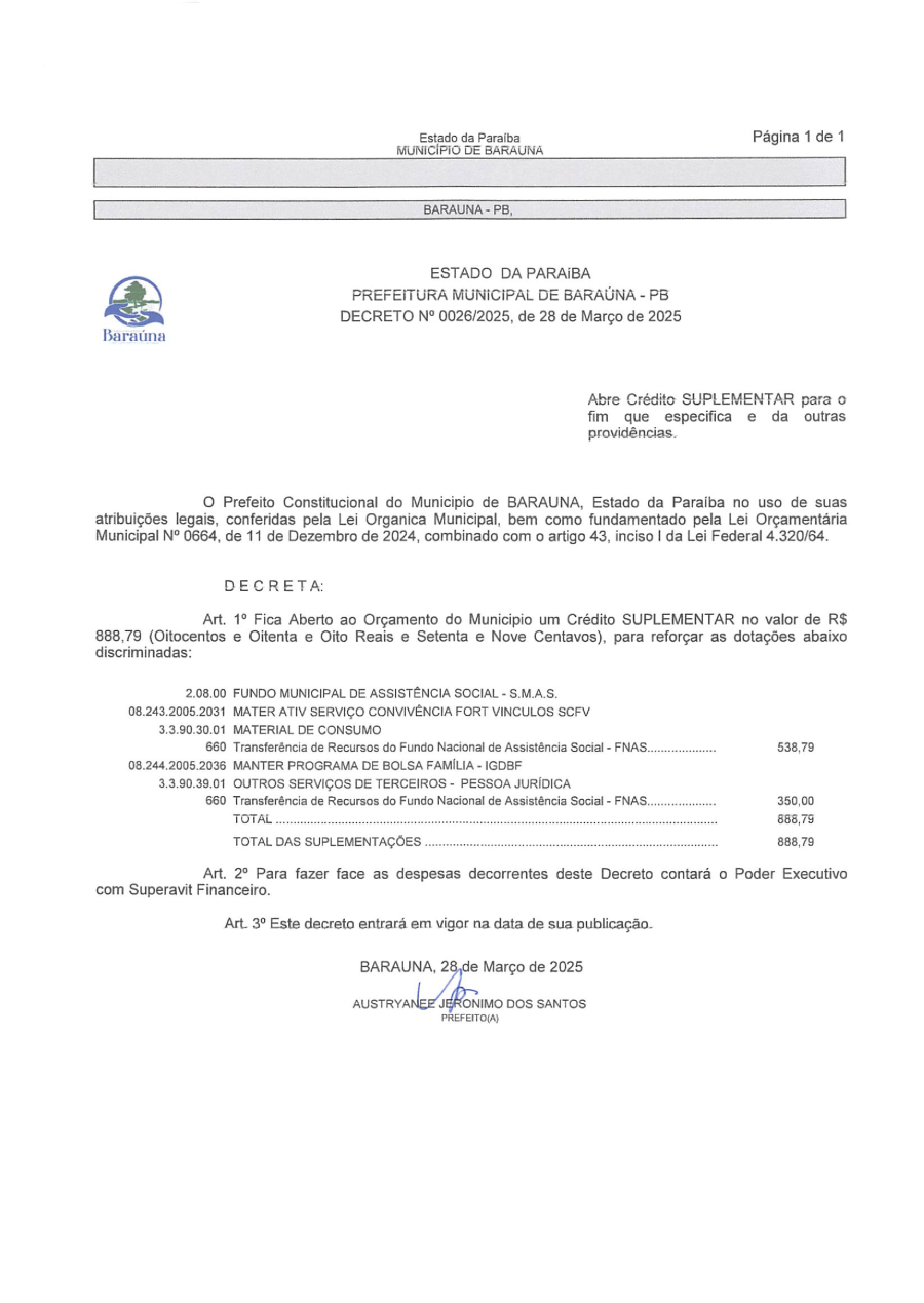 DECRETO Nº 026/2025 ABRE CREDITO SUPLEMENTAR PARA O FIM QUE ESPECIFICA E DA OUTRAS PROVIDÊNCIAS. - 16 DE JULHO DE 2025.