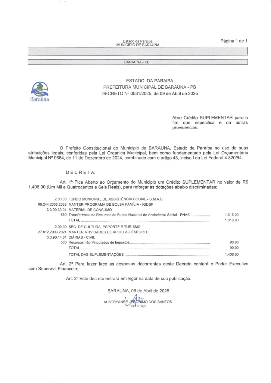 DECRETO Nº 031/2025 ABRE CREDITO SUPLEMENTAR PARA O FIM QUE ESPECIFICA E DA OUTRAS PROVIDENCIAS. - 17 DE JULHO DE 2025.