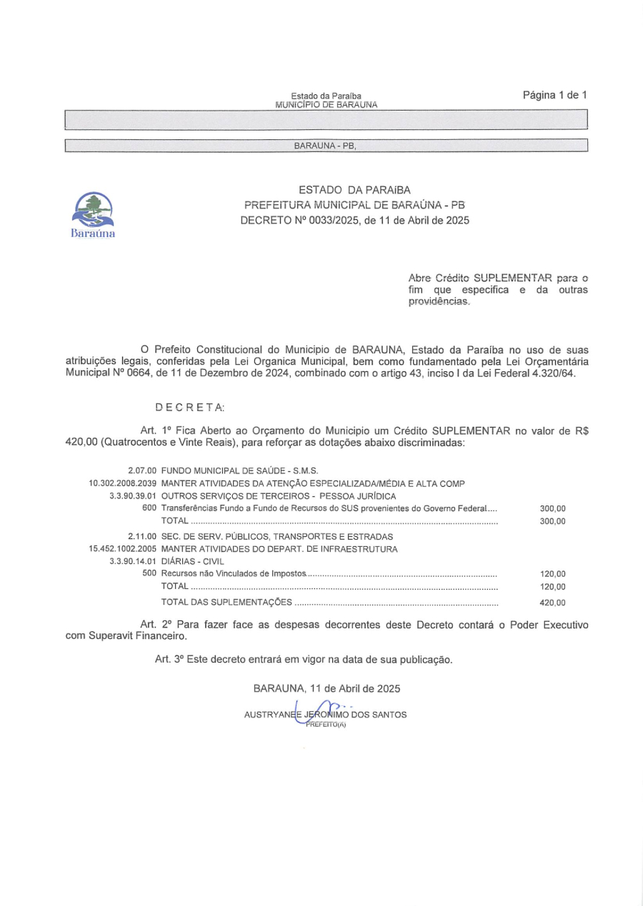 DECRETO Nº 033/2025 ABRE CREDITO SUPLEMENTAR PARA O FIM QUE ESPECIFICA E DA OUTRAS PROVIDENCIAS. - 17 DE JULHO DE 2025.