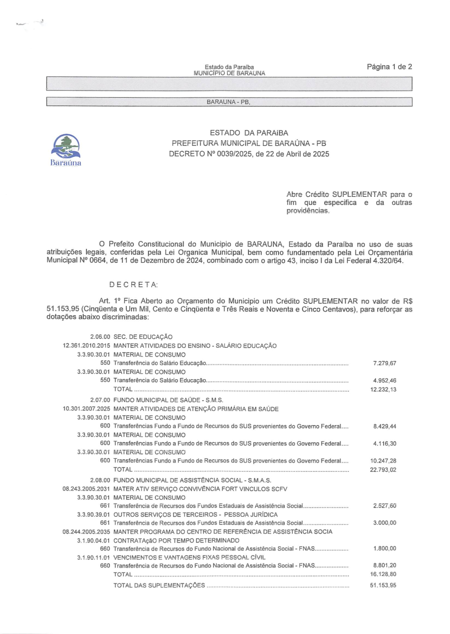 DECRETO Nº 039/2025 ABRE CREDITO SUPLEMENTAR PARA O FIM QUE ESPECIFICA E DA OUTRAS PROVIDENCIAS. - 17 DE JULHO DE 2025.