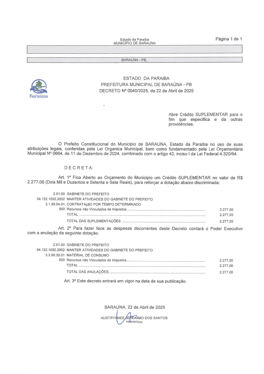 DECRETO Nº 040/2025 ABRE CREDITO SUPLEMENTAR PARA O FIM QUE ESPECIFICA E DA OUTRAS PROVIDENCIAS. - 17 DE JULHO DE 2025.