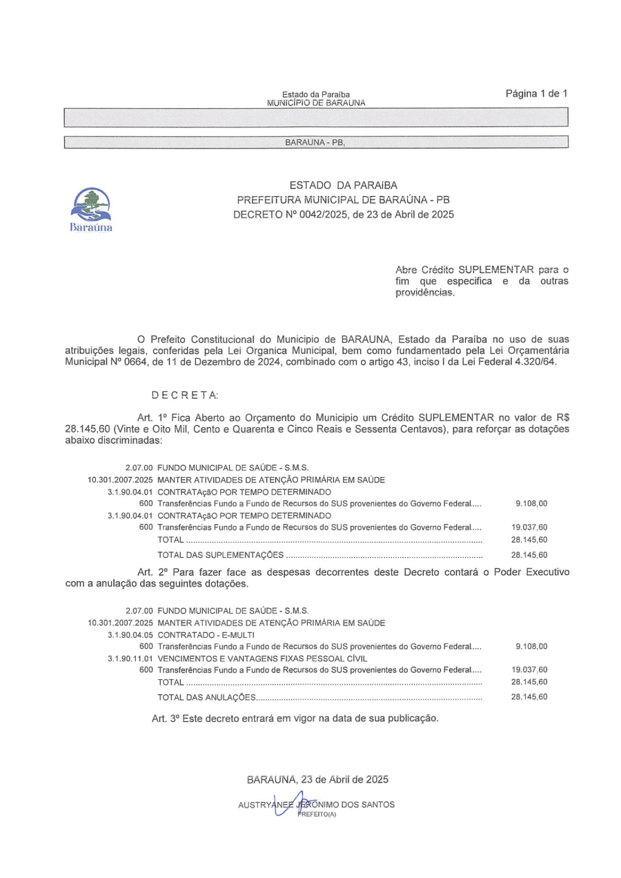DECRETO Nº 042/2025 ABRE CREDITO SUPLEMENTAR PARA O FIM QUE ESPECIFICA E DA OUTRAS PROVIDENCIAS. - 17 DE JULHO DE 2025.