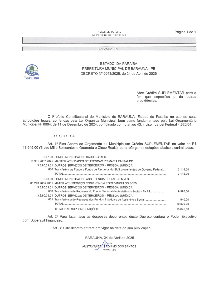 DECRETO Nº 043/2025 ABRE CREDITO SUPLEMENTAR PARA O FIM QUE ESPECIFICA E DA OUTRAS PROVIDENCIAS. - 17 DE JULHO DE 2025.