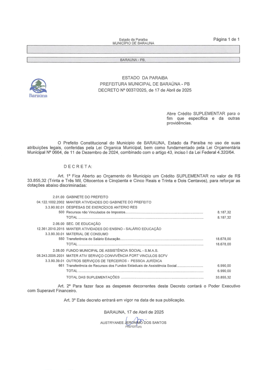 RETIFICAÇÃO - DECRETO Nº 037/2025 ABRE CREDITO SUPLEMENTAR PARA O FIM QUE ESPECIFICA E DA OUTRAS PROVIDENCIAS. - 17 DE JULHO DE 2025.