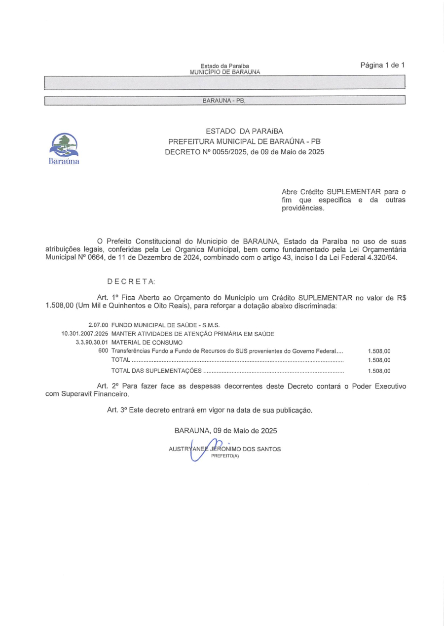 Conforme MP n° 2.200-2 de 24/08/2001, que institui a infraestrutura de chaves Públicas. Matéria Publicada no Diário Oficial do Município de Baraúna/PB no dia - Edição 01281.